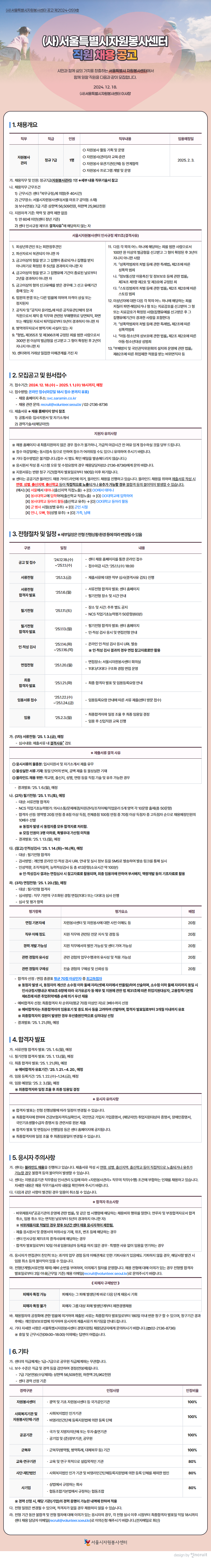 입찰/채용 [채용] (사)서울특별시자원봉사센터 직원 공개 채용 2024.12.19 관리자 자원봉사관리 채용 직무기술서_서울특별시자원봉사센터.pdf 이전글 [채용] 서울특별시자원봉사센터 비상임 임원 후보자 모집 공고 목록 다음글 [채용] 종로구 자원봉사센터에서 2025 자원봉사센터 코디네이터 채용 공고