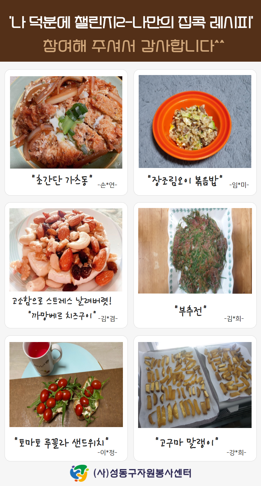 자원봉사자 스토리 [성동구센터]코로나19-나 덕분에 챌린지2 관리자 2020.11.03 1936 [성동구자원봉사센터]에서는 코로나19속에서 간단하고 쉽게 따라 할 수 있는 나만의 홈쿠킹 '나 덕분에 챌린지2-나만의 집콕레시피'를 실시하였습니다. 이전글 [경기 하남시] 안녕! 플라스틱 줄이기 캠페인 목록 다음글 [김해센터]안녕! 함께할게~ 일회용품 싹쓰리~!