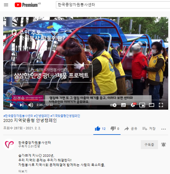 한국중앙자원봉사센터 유튜브, (2:20초 이후)삼척시자원봉사센터 김경숙 자원봉사자 인터뷰