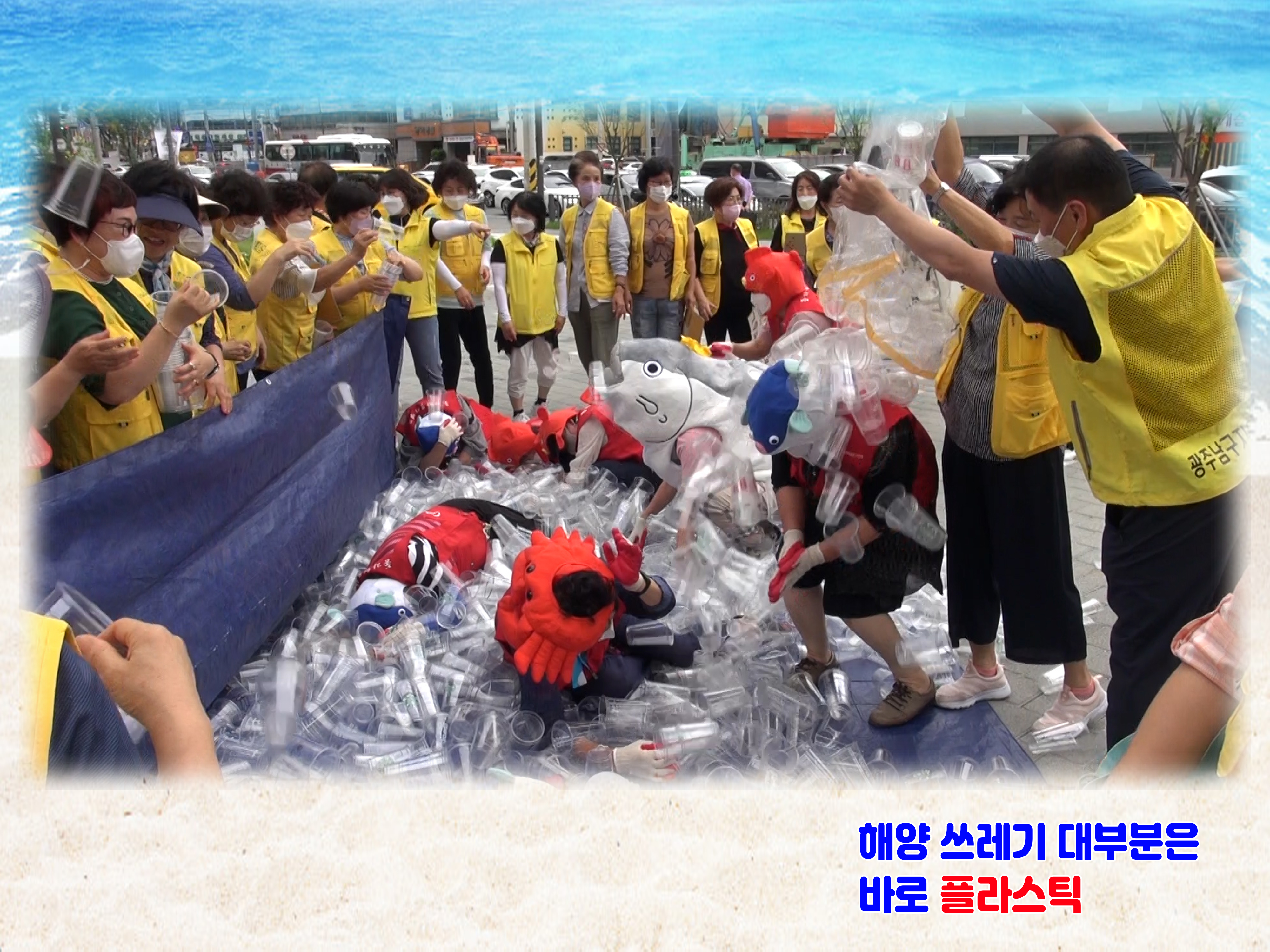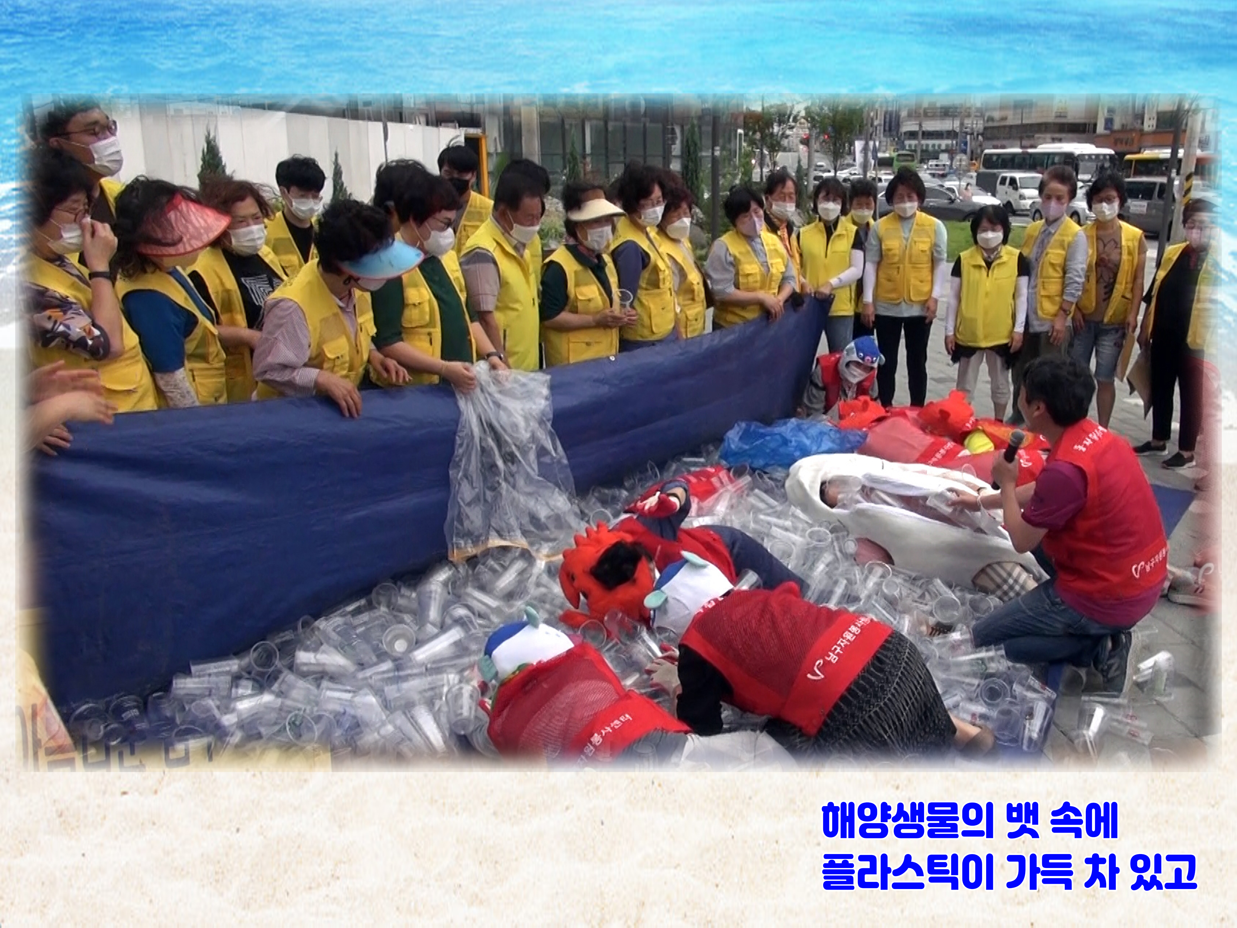 ‘플라스틱 바다 퍼포먼스’와 함께 박스로 만든 피켓을 이용해