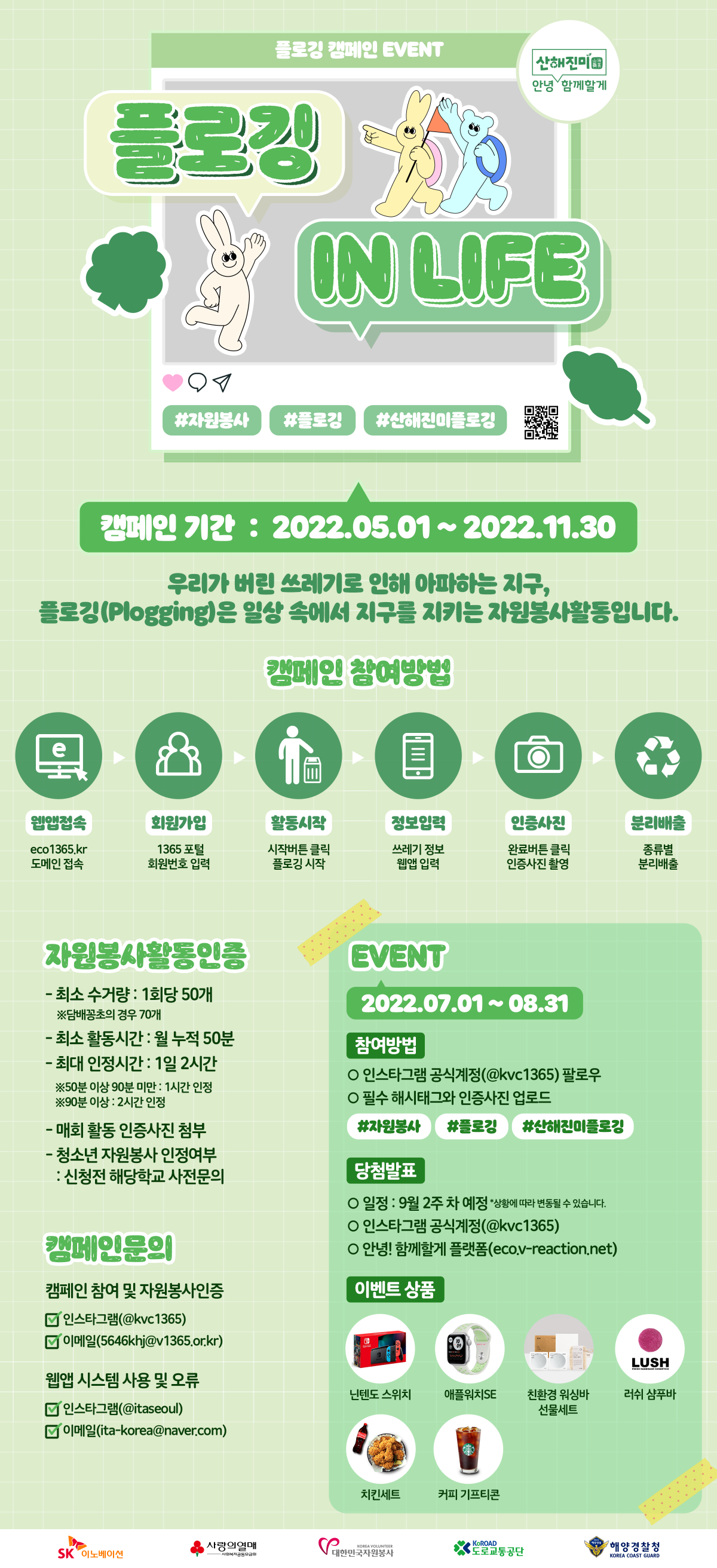 주요행사 [2022] 안녕! 산해진미 함께할게 이벤트 : 2회차 2022.07.01 ~ 2022.08.31 한국중앙자원봉사센터 이전글 [2022] 안녕! 산해진미 함께할게 이벤트 : 초성 ... 목록 다음글 [2022] 한국관광공사 코리아둘레길 플로깅 이벤트...