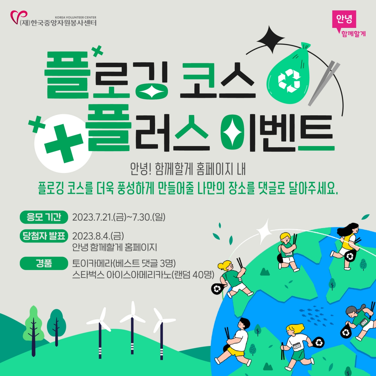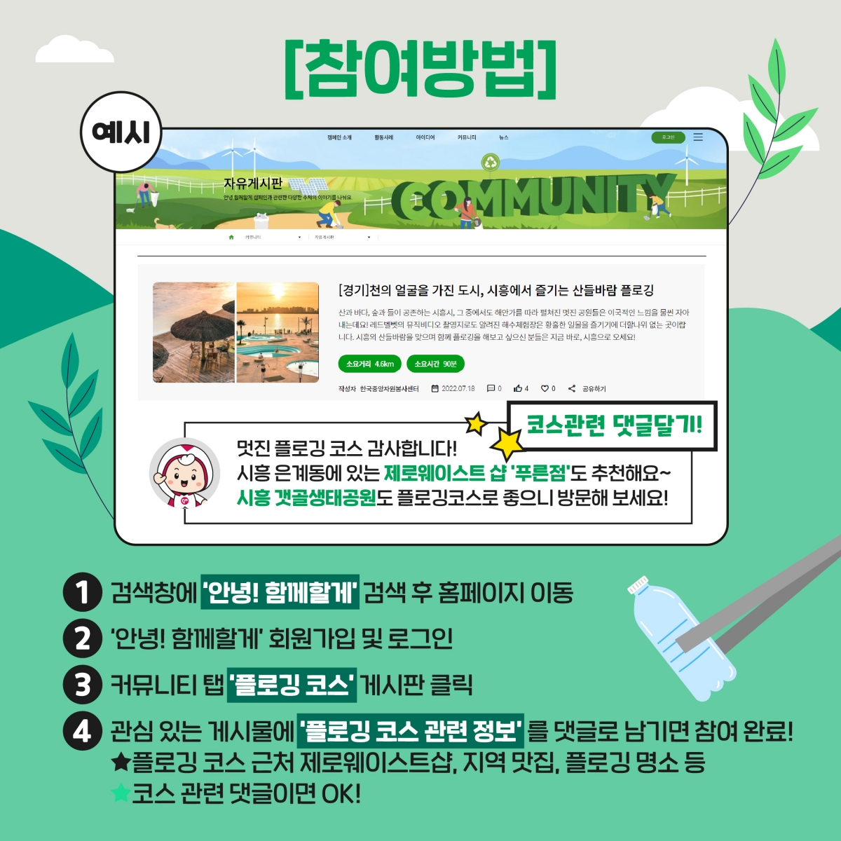 본 이벤트는 안녕 함께할게 홈페이지의 ‘플로깅 코스’ 게시판의 게시물에 코스관련 댓글을 남겨주셔야 참여 완료가 됩니다! 이 점 참고하시어 이벤트 참여를 부탁드립니다