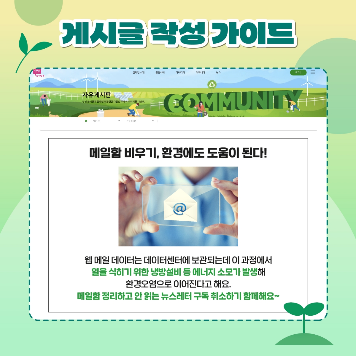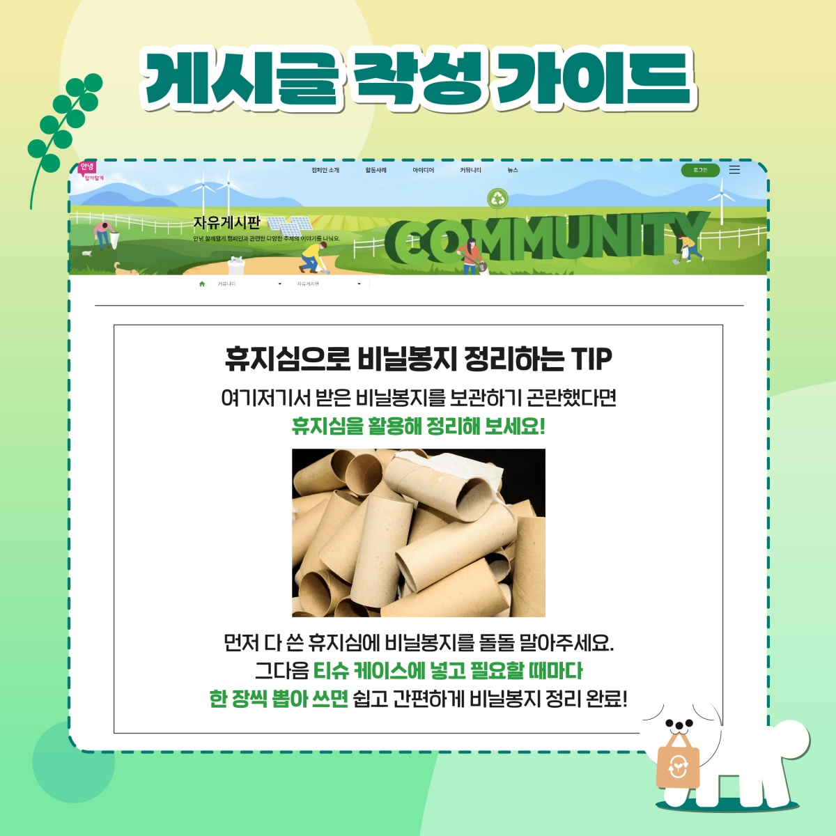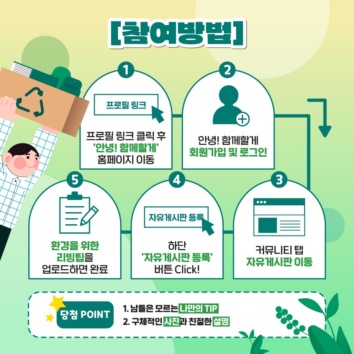 커뮤니티 탭 - '자유게시판' 에 지구를 위한 리빙팁을 공유해주셔야 참여 완료됩니다.