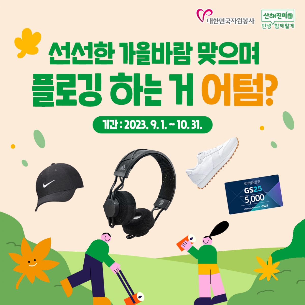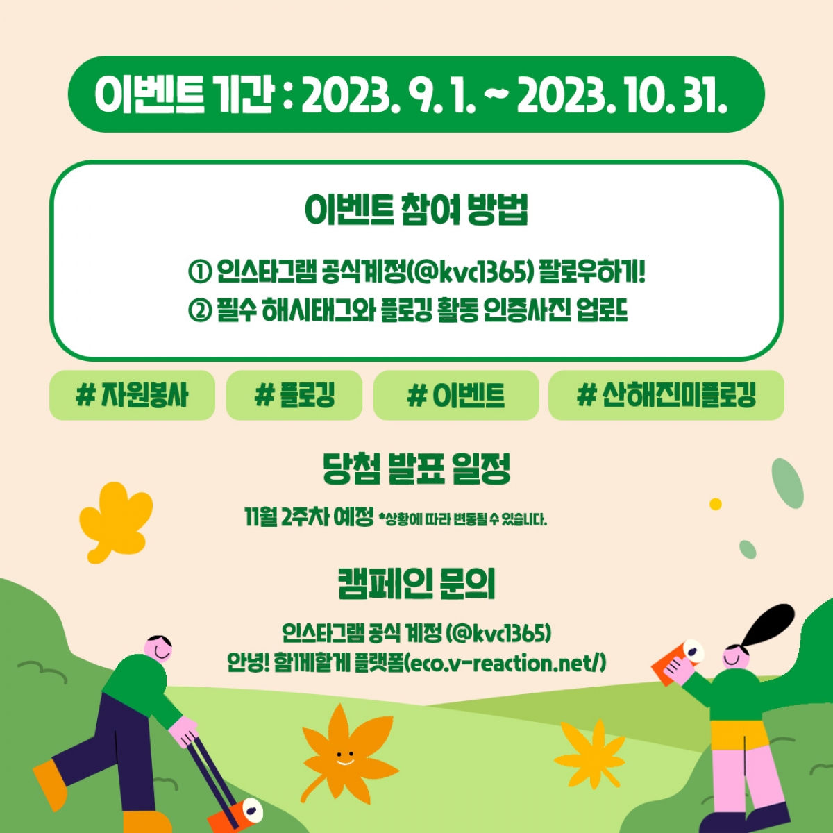 주요행사 [2023] 안녕! 산해진미 함께할게 이벤트 : 3회차 2023.09.01 ~ 2023.10.31 한국중앙자원봉사센터 이전글 [2023] 안녕! 산해진미 함께할게 이벤트 : 플로깅... 목록 다음글 [2023] 탄소중립 자원봉사 아이디어 콘테스트...
