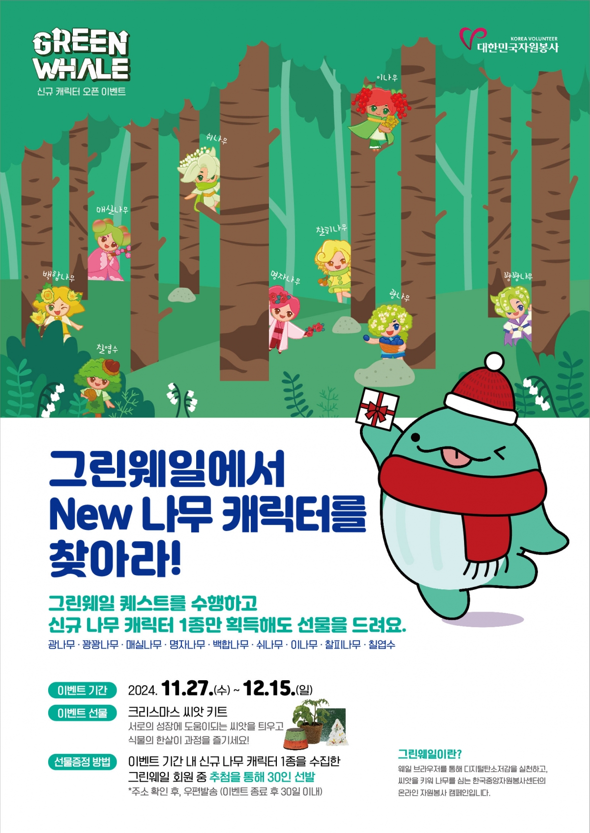 - 참여방법 : 그린웨일 퀘스트를 수행하여 신규 나무 캐릭터 1종 획득