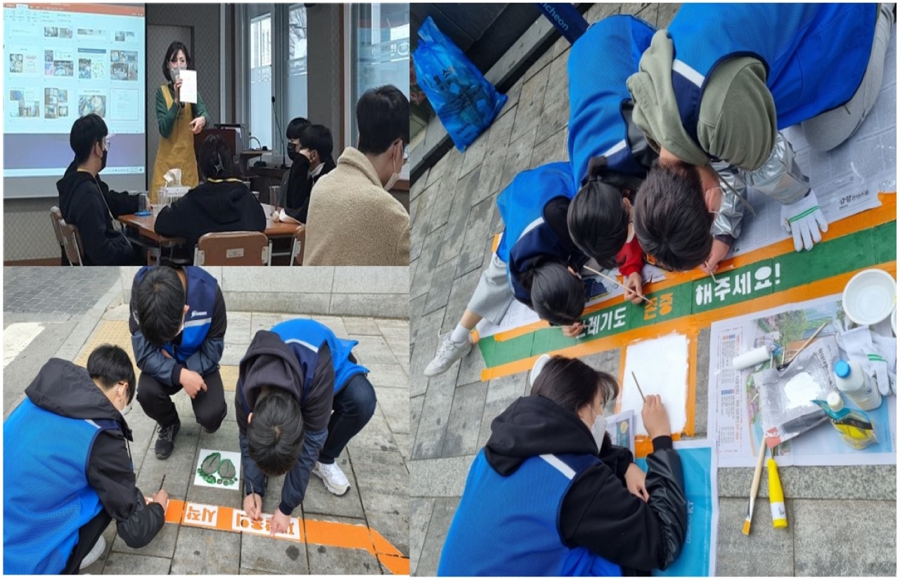 그 후 청소년들과 지구환경과 기후위기에 관한 교육을 진행하고 고체치약을 만들어보는 OT를 진행하였고 활동은 집하장 표시만 되어있는 곳 바닥에 안내선을 그리고 문구를 적어 시민들에게 함께 할 수 있도록 안내하고 있습니다.