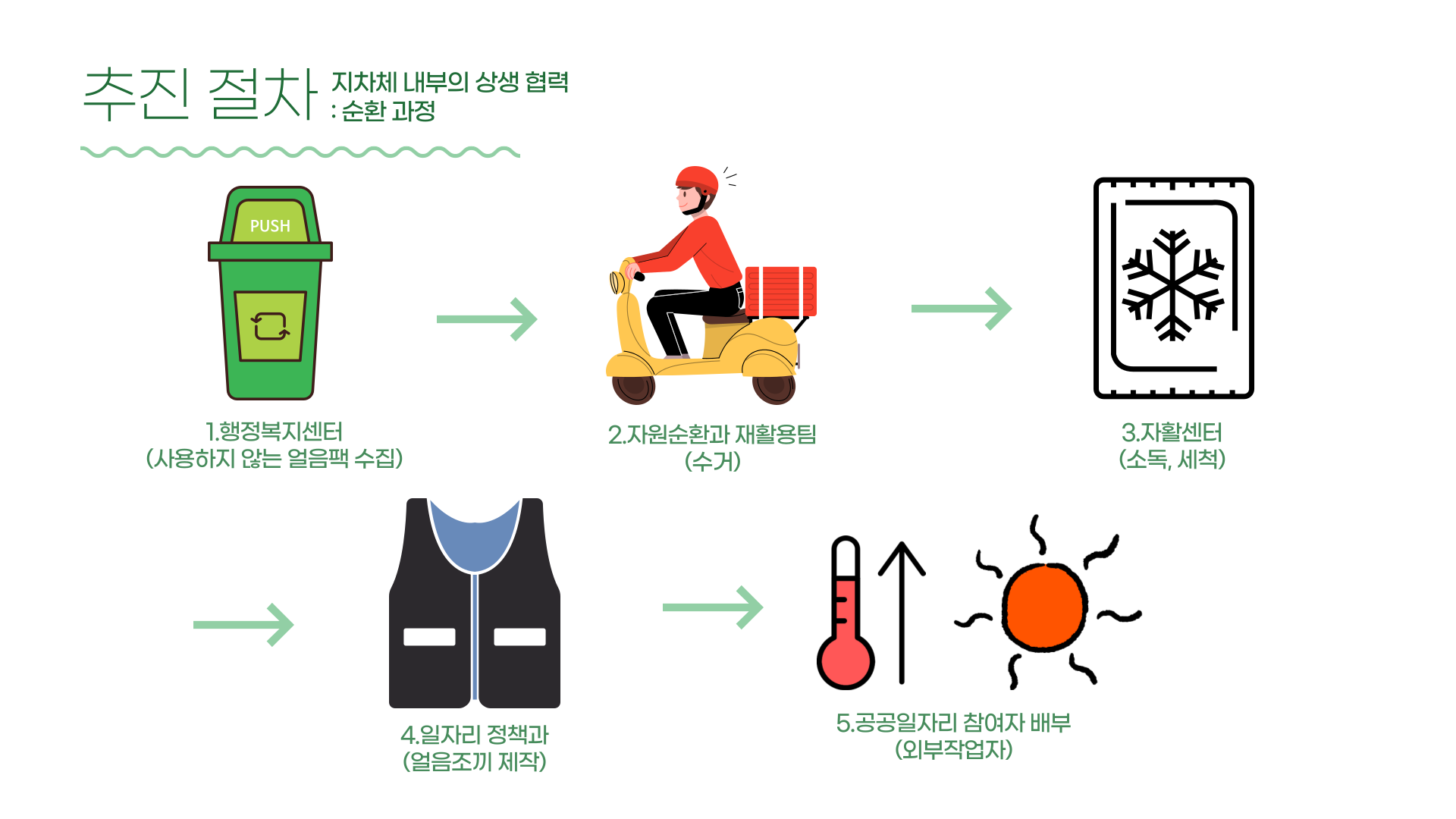 해당 아이스조끼 아이디어는 현재 부천시에서 시행하고 있다. 아이스조끼 제작부터 운반과정까지 부천시의 공공일자리인력을 통해 이루어지고 있다. 무더위에 지친 사람들을 도와주면서도 직접 일자리 창출이란 결과에 도출 할 수 있었다.