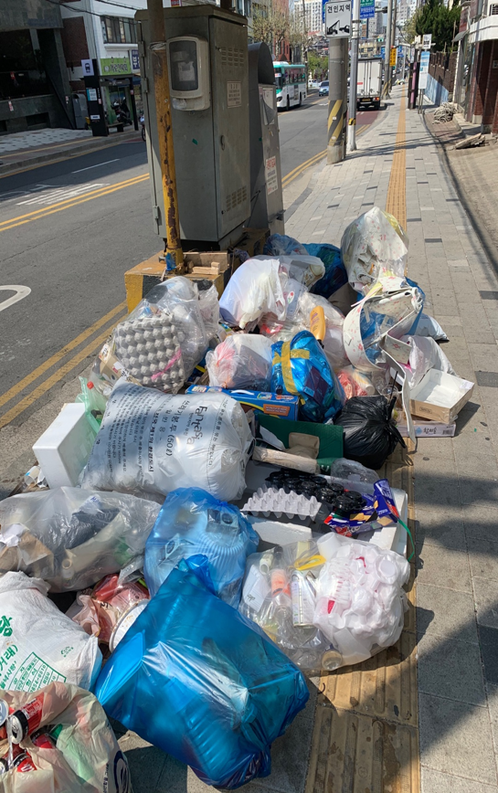 특히나 그 시점이 코로나19와 겹치면서 다양한 일회용품을 더욱 마음편하게 쓸 수 있었고 당연하게도 환경문제보다도 안전이 우선시 되면서 한발짝 전진하려고 했던 쓰레기 관련 정책들이 다시 두발짝 퇴보했던 시점이었다. 그래서 그런지 당장 집 앞에서만 하더라도 분리수거가 되지 않은채로 모두 같은 봉투에 담겨져 있는 쓰레기들이 매일 아침마다 산더미씩 쌓여있었다. 쓰레기들을 보면서 매일 이 정도의 양이 이 구역 뿐만 아니라 다른 구역에서도, 그리고 소사구만 아니라 다른 구에서도, 부천시만 아니라 다른 지역에서도 나온다고 생각하니 이 쓰레기 처리 문제에 대해 눈앞이 깜깜해졌다. 환경부에 따르면 2017년 기준 하루 발생 폐기물은 41만 톤 수준으로 증가 추세에 있으며 2015년 기준 한국의 1인당 연간 플라스틱 소비량은 132.7kg으로 세계 최고 수준이라고 한다. 이러한 가운데 2018년 4월 수도권을 중심으로 ‘쓰레기 대란’이 발생했었다. 뉴스에 나왔지만 나와 직접적인 관련이 없어서 외면했던 그 사건을 이제 내가 걱정해야 하는 상황에 와보니 변화가 시급했다. 당시 수거되지 않은 비닐과 플라스틱이 집에 점점 쌓여 시민들은 불편을 겪어야만 했다고 하는데 집 앞에 쓰레기 산을 보니 이젠 그게 나의 일이 될 수도 있다고 생각했다.