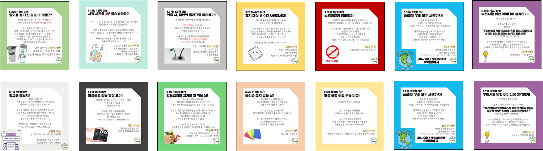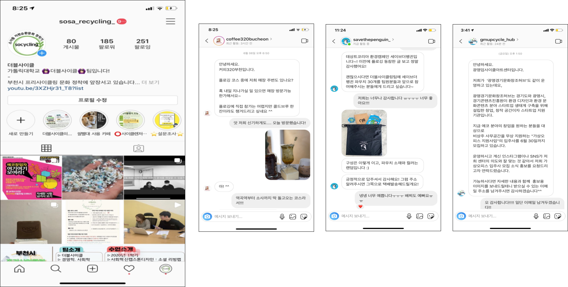 세가지 활동을 통해 활동을 진행하는 사람들과 기획하는 우리들의 일상생활에서의 마인드가 많이 달라졌다. 사소하게도 환경을 위할 수 있고 잠깐의 귀찮음과 변화가 미래세대를 위한다는 생각을 끊임없이 생각하게 되었던 시간인 것 같다. 이러한 변화과정을 우리만 보기 아깝다는 생각에 우리의 생각과 작은 실천들을 SNS에 올렸었다. 정말 신기하게도 소사동 카페 302와 데상트 코리아 세이브더 펭귄, 광명 업사이클 아트센터 등의 콜라보 제의를 받았고 환경을 위한 작은 움직임으로 시작한 활동들이 다른 연결고리가 되어 더 큰 물결을 일으킬 수 있다는 생각을 하게 되었다. 그래서 우리의 친환경 서포터즈와 데상트 코리아 세이브더 펭귄과 함께 플로깅도 진행했었다. 개인 내적인 변화도 컸지만 이러한 눈에 보이는 변화들이 이 활동을 지속하게 만든 원동력이 되었던 것 같다.
