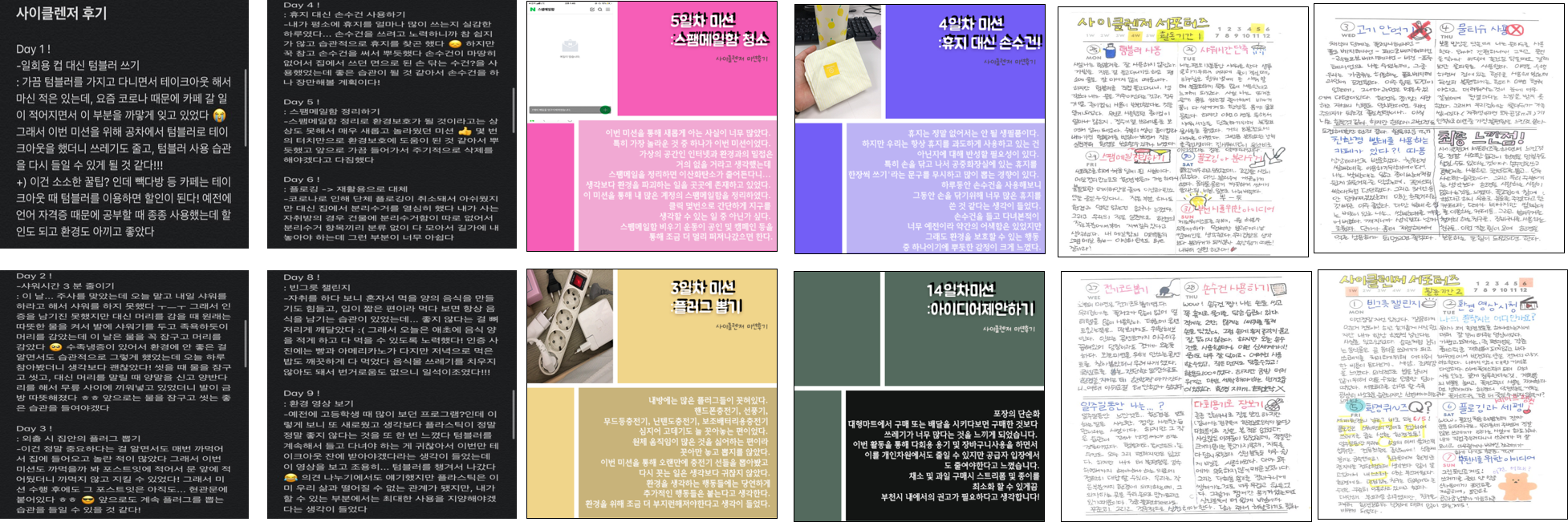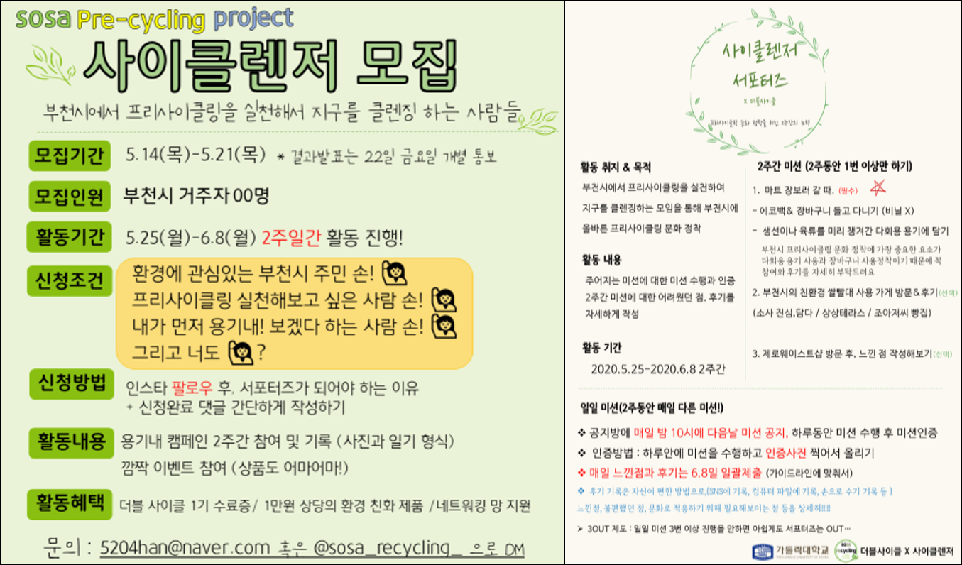 마지막으로 ‘더블 사이클’팀은 SNS를 통해 친환경 서포터즈 ‘사이클렌저’를 모집하였다. 프리 사이클링 운동에 참여할 의사 있는 부천시 주민 7명 선발하여 일일 미션과 상시 미션 구성하였다. 일일 미션은 간단하지만 혼자서는 지속적으로 하기 어려웠던 미션들로 구성했고, 상시 미션은 생선이나 육류 구매 시 다회용 용기 사용을 중점으로 부천시에 프리 사이클링 문화 정착에 중요한 요소들로 구성했다. 또한 친환경 빨대 사용 가게 방문 후 후기 남기기와 제로 웨이스트 샵 방문을 통해 프리 사이클링을 직접 체험해보도록 했다. 사이클렌저 서포터즈는 2주간 14개의 일일 미션을 진행하였으며 참여율은 평균 74.1%를 기록했다. 서포터즈 종료 후 시행한 설문조사 결과에 따르면, 개인적인 사정으로 인해 참여하지 못한 미션을 제외하고는 대부분 열심히 참여했다고 응답했다.
