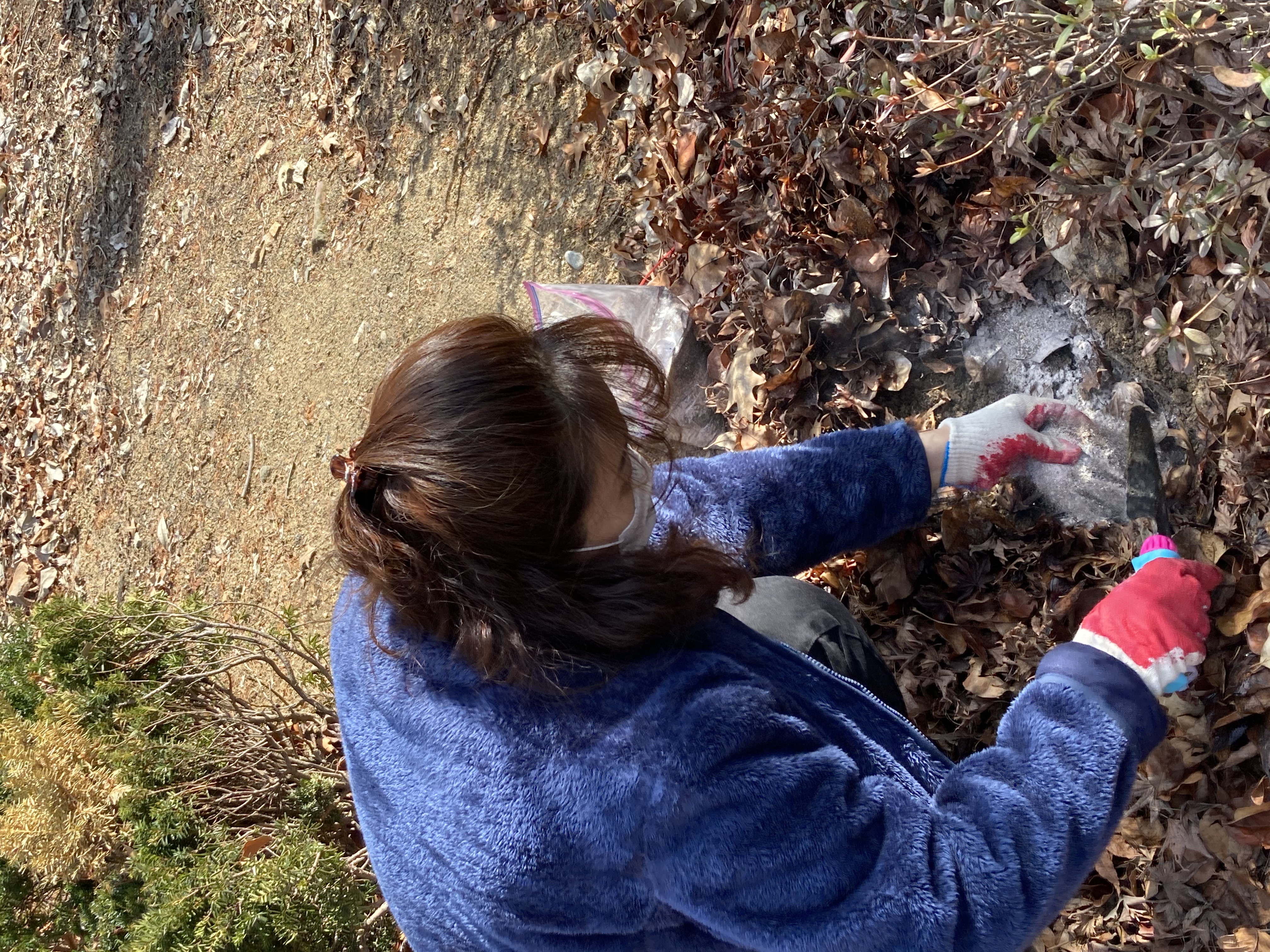 친환경비료를 지정된 공원에 가 비료만들기 포토존 의자에서 사진 촬영 후 모종삽과 장갑을 꺼내어 지정된 장소에 비료를 직접 뿌려주고 있습니다.