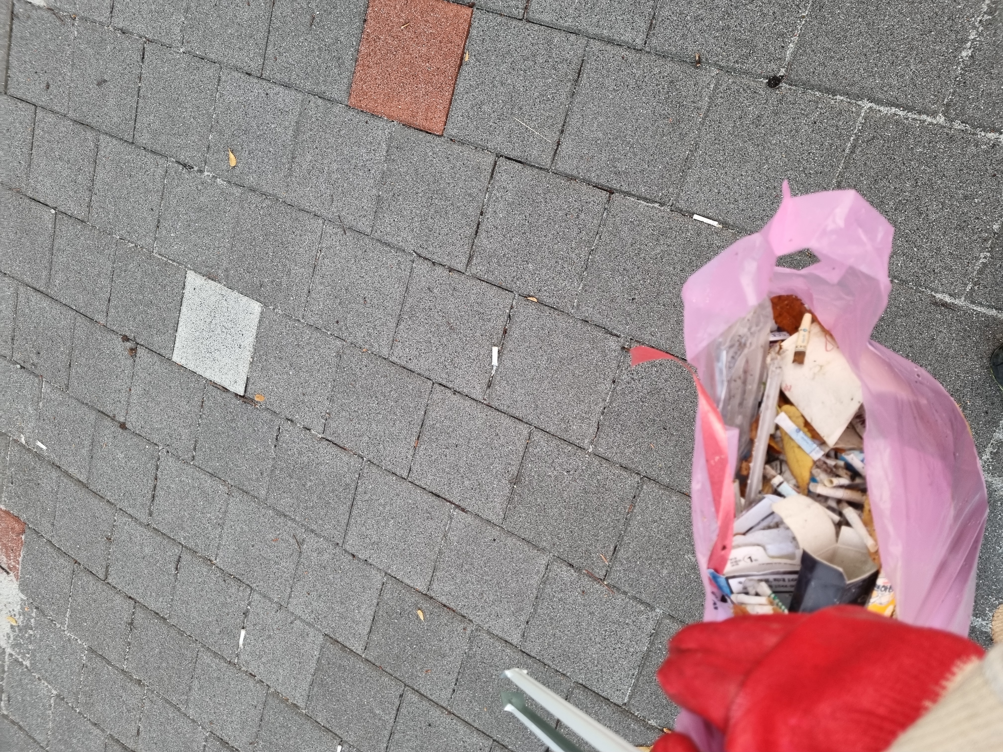- 일반쓰레기봉투와 재활용 가능한 쓰레기를 담을 봉투 두 개를 들고 플로킹을 나서게 되었습니다. 재활용 가능한 것들은 집에서 세척 후 분리수거 하는 방향으로 진행하였습니다.