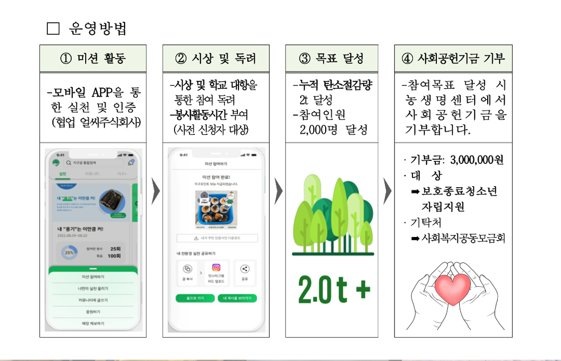 또한, 청소년들의 참여를 통해 탄소배출 절감량 목표 2.0t 달성 시 '보호종료 청소년 자립지원'에 사회공헌기금을 전달하는 순환구조를 구축하였습니다.