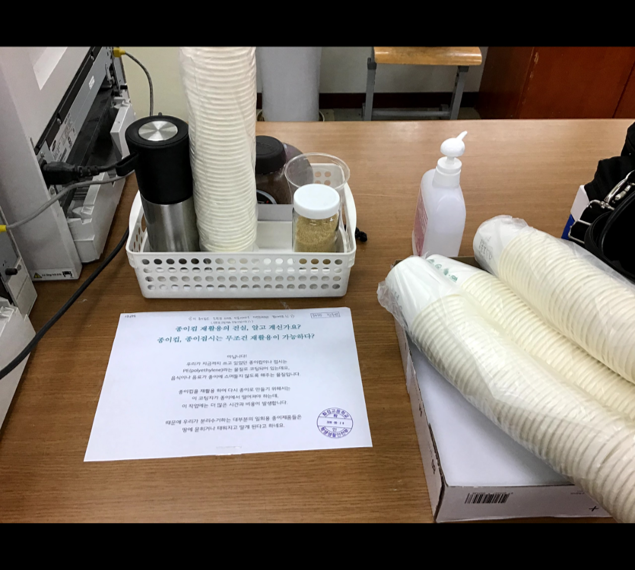 저는 계속 아무 문제 의식 없이 종이컵을 사용하던 사람들에게 종이컵에 대한 문제를 제기하며 사용을 아예 하지 말자고 제안하는 것 보다는 문제를 제기 하면서 사람들이 직접 스스로 환경을 위해 행동하기 위한 기다림의 시간과 함께 합의점을 찾아주는 것이 좋다고 생각했습니다. 그래서 캠페인을 "종이컵을 쓰지 맙시다" 의 문구가 아닌 "종이컵 사용을 줄입시다"와 "그래도 사용해야 한다면 환경을 위해 친환경 종이컵은 어떨까요?" 라는 대안과 함께 제시 했습니다. 분해성 코팅제를 이용해 흙 속에서 자연적으로 분해 되는 친환경 종이컵을 캠페인 글과 함께 교무실에 함께 비치 해두며 오고 가는 많은 학생들과 선생님들이 자연스럽게 접할 수 있도록 캠페인을 진행했습니다.