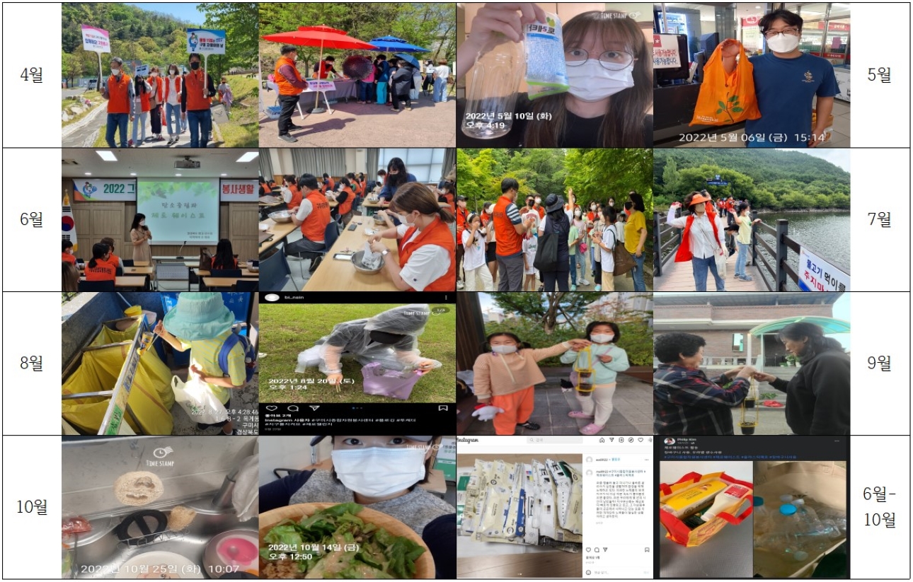이 중 6월과 7월에 진행한 활동은 경상북도 환경연수원 환경 강사분들과 함께 활동을 진행하며 환경과 탄소중립에 대한 정확한 정보를 교육하고 전달하며 활동을 진행하였고, 마지막 10월 활동은 봉사자 스스로 활동의 세부 내용을 구상해 활동을 진행할 수 있도록 하여 지금까지 이어 온 활동 경험을 통해 봉사자 주도의 활동을 진행할 수 있도록 하였습니다. 상시로 진행하는 제로웨이스트 활동도 함께 운영하며 환경 관련 활동에 대한 지속적인 관심과 실천을 유도하였습니다.