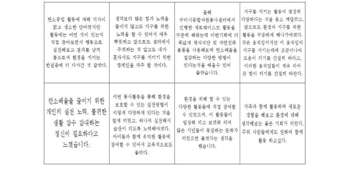 이렇듯 활동을 통해 자원봉사자와 시민들이 환경 문제에 대해 더욱 더 관심을 가지게 되고, 친환경적 실천으로 이어지게 되어 탄소중립으로 향하는 발걸음에 큰 힘이 되었으면 하는 바램입니다.