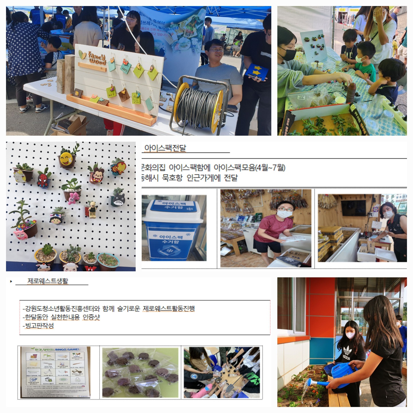 플라스틱줄이기 10계명으로 서명운동을 진행하고 홍보하면서 함께 실천할것을 다짐받고, 해양쓰레기인 폐목재를 이용해 축제때 열쇠고리를 만드는 업싸이클링, 친환경수세미뜨기, 아이스팩모아 묵호항 에서 장사하시는 상인들에게 나눔활동, 청소년문화의집 작은공간을 이용해 텃밭가꾸기, 커피캡슐을 이용한 다육화분반들기및 커피찌꺼기를사용하여 천연스크럽만들기 체험, EM을 이용한 주방세제만들기 등 다양한 체험과 활동을 동해시민들과 함께 진행하고 나눔활동을 하고 지속적으로 하고자 했습니다.