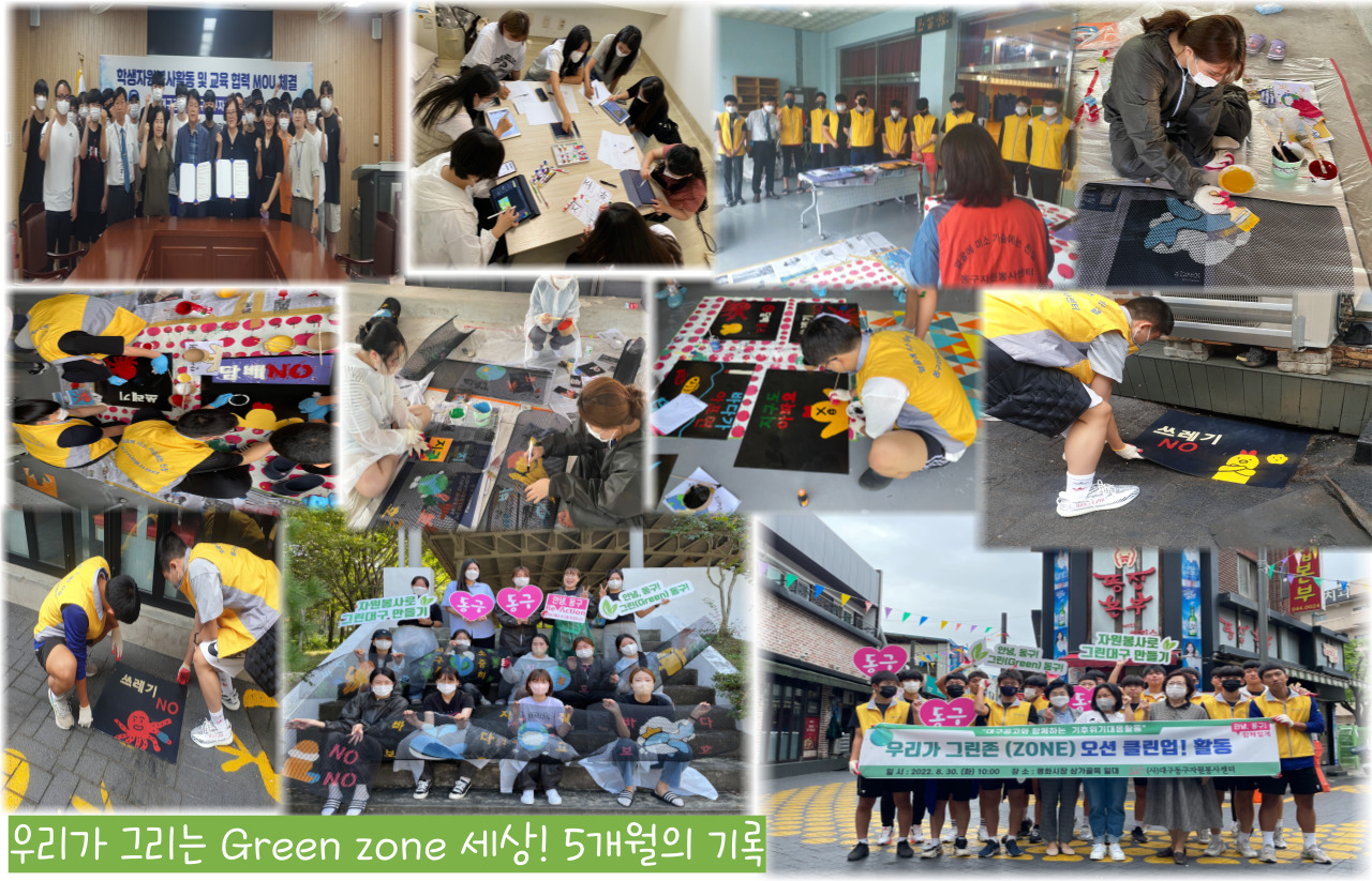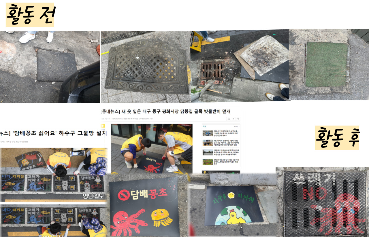 문제 해결을 위한 여러 방법을 모색 중 타 시도 하수구의 담배꽁초 예방 활동을 벤치마킹을 통해 시범적으로 진행하였습니다. 그 방법으로는 촘촘하지만 담배꽁초가 들어가지 못하는 구멍 크기의 PE망에 페인트를 활용하여 담배꽁초·쓰레기로 피해를 입는 해양생물과 경각심을 줄 문구를 칠하여, 시민들이 쓰레기를 무단으로 투기하지 않도록 유도하고자 하였고, 완성된 PE 망을 통행하는 시민들이 불편하지 않도록 하수구에 단단히 고정하였습니다. 또한, 상가 골목의 특성상 기름을 많이 사용하여 하수구 악취로 어려워하는 부분은 냄새방지와 더불어 쓰레기와 담배가 유입되지 않는 고무판을 맞춤 제작하여 고무판위 그림을 그려 덮어놓았습니다.