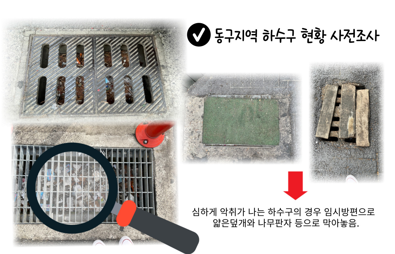 해양 쓰레기에 대한 물음표를 던지고 알아가던 중 하수구를 통한 무분별한 쓰레기 배출과 심각한 담배꽁초로 오염되어 해양생물까지 위협받고 있는 사실에 하수구로 유입되는 부분을 어떻게 하면 막을 수 있을까? 라는 생각으로 제일 먼저 우리 동구 지역 하수구를 조사하기 시작했고 들여다본 하수구 속은 담배꽁초와 무분별하게 버려진 쓰레기들 심한 곳은 악취가 나거나 악취가 나는 곳은 발판과 나무판자 등으로 막아놓은 곳도 볼 수 있었습니다.
