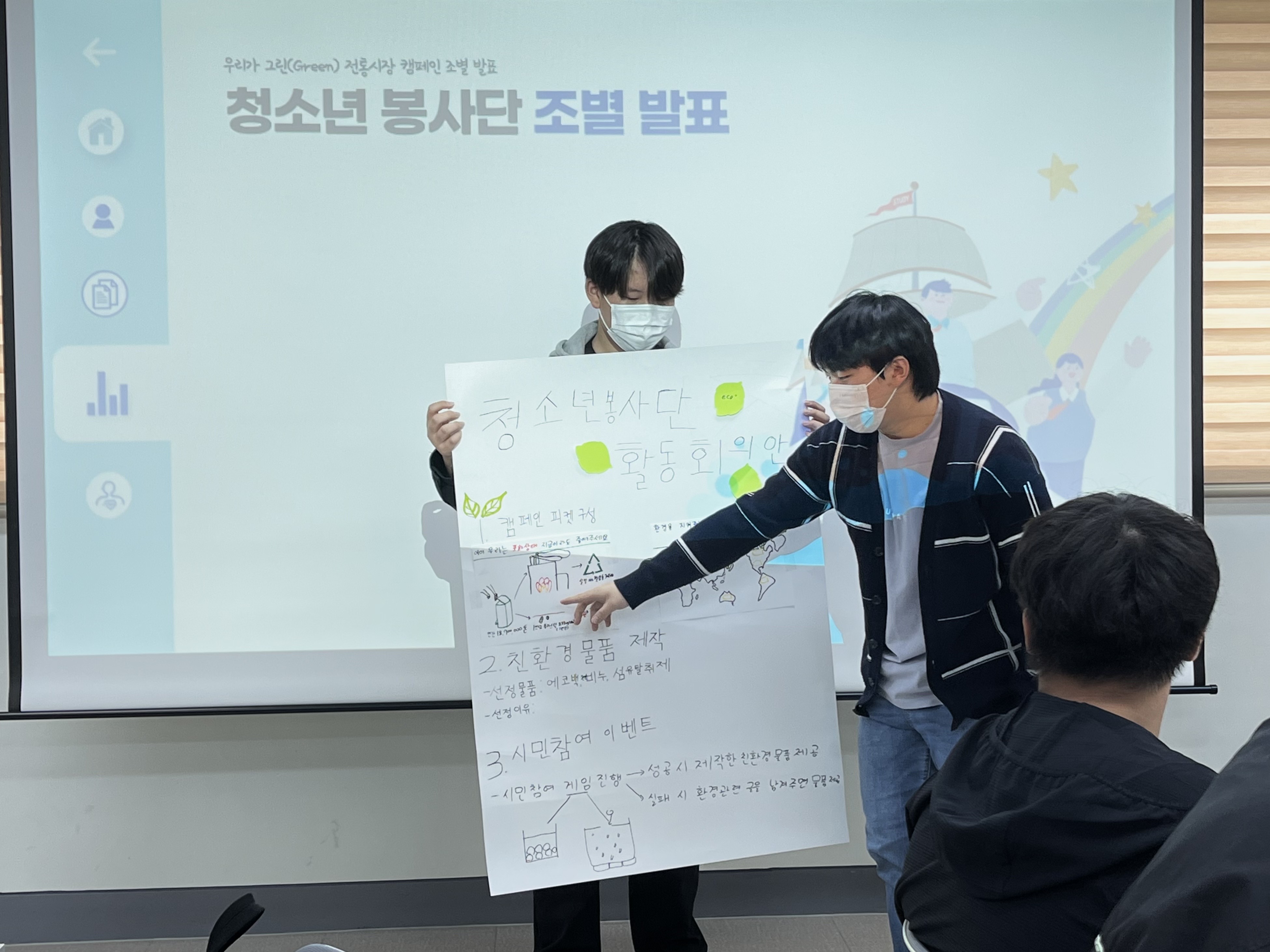 ○ 이러한 내용을 바탕으로 전통시장에서 할 수 있는 탄소중립활동에 대해 함께 고민해보는 회의를 하였다. 처음에는 적극적으로 의견을 내기 어려워하는 모습을 보였지만 한,두명의 의견이 모아지면서 자신의 경험과 더불어 환경보호를 위한 다양한 의견을 내면서 브레인스토밍이 가능해졌고, 경험이 부족한 청소년들은 또래의 경험들을 공유하며 소통의 방법을 터득해나가며, 지역과 환경에 관심을 가지고 청소년들이 하고 싶은 일, 할 수 있는 일을 하나씩 정리해가며 일련의 활동계획을 수립해나갔다.