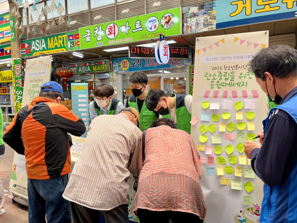 ○ 세 번째, 청소년 활동이 정기적으로 되면서 시장상인들과 시장 이용주민들과의 유대감이 생길 수 있었다. 지역내 전통시장이 많이 분포되어 있어 매번 다른 장소를 섭외를 고려하였으나 청소년들이 같은 장소에 같은 주제로 활동을 하는 것이 홍보에 더욱 효과적이라는 의견에 공감을 얻었다. 캠페인 활동시 시장 상인 및 시장 이용주민들을 대상으로 생활 속 탄소중립 활동과 관련된 메시지를 적을 수 있도록 하고, 어머니또래의 시장 이용주민들이 환경과 관련된 자원봉사활동을 하는 청소년들을 보며 다시금 어른으로서의 책임을 느끼고, 실천하는 힘을 기르게 해주었다. 청소년 캠페인을 접한 주민들이 청소년들을 다시 만났을 때 실생활에서 사용한 친환경제품의 장점을 이야기하며 청소년들을 격려하고, 다독여주는 교류를 통해 우리 지역의 공동체성이 형성되어 가는 것을 느낄 수 있었다.