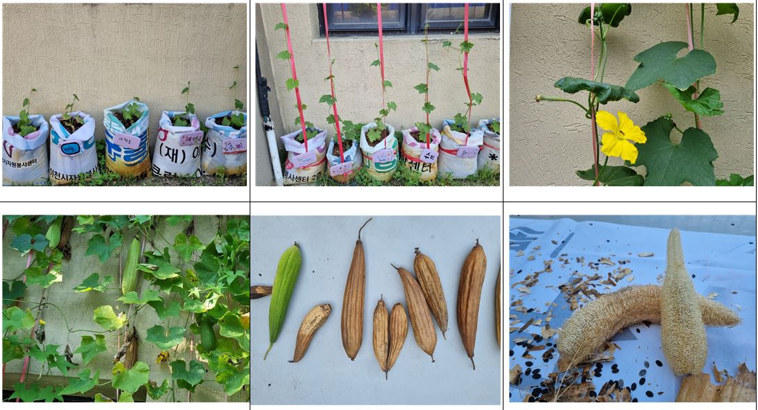 폐현수막을 이용하여 만든 폐현수막 화분에 수세미 모종을 키우다 보니 배수가 너무 잘되어 매일 아침 수세미 화분 물주기로 하루를 시작하게 되었으며, 수세미의 성장 속도가 너무 빨라 수세미를 키우는 공간이 부족했다. 많은 수세미를 수확해서 나눔 행사를 진행하려고 계획했으나 생각보다 적은 수량을 수확하게 되어 아이들과 함께 관찰하고, 씨앗을 직접 채집해보고 수세미를 만드는 과정을 체험하는 과정으로만 진행하여 아쉬웠다.