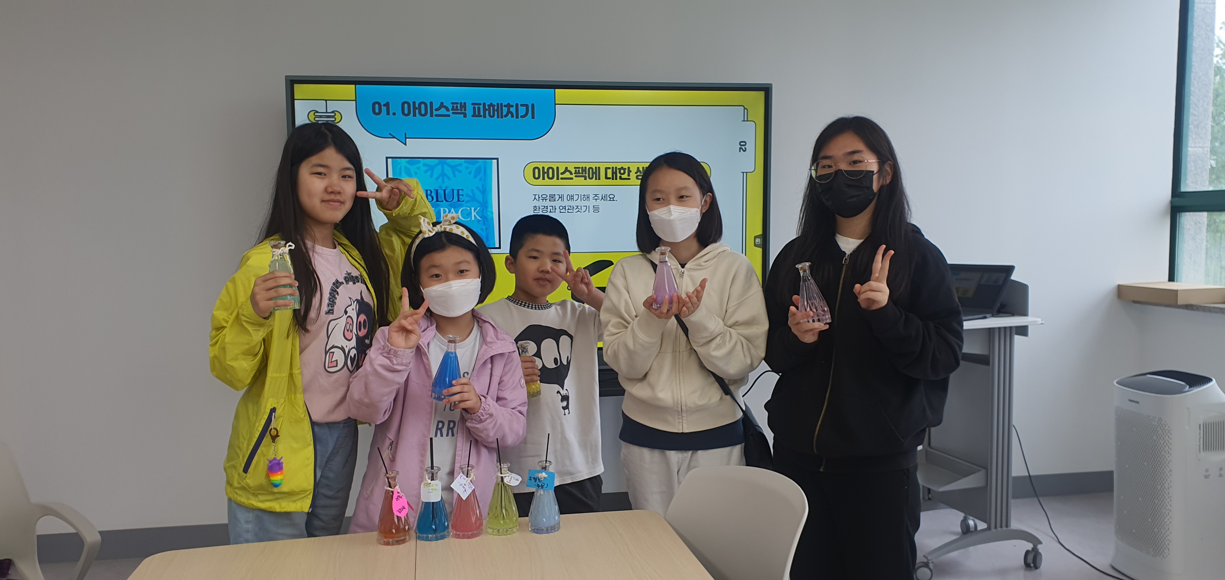 서구청소년센터에서 진행하는 어울림마당에 젤아이스팩 디퓨저만들기 업사이클링 부스를 운영하였습니다. 운영을 통하여 어떻게 젤아이스팩이 디퓨저로 제작되는지의 과정과 젤아이스팩이 왜 환경을 오염시키는지에 대한 방법들을 전달 할 수 있었고 판매로 인한 수익금은 환경을 위해 고생하시는 환경공무원분들을 위해 간식을 구매하는 것으로 활용되어서 지역사회에도 도움이 되는 활동으로 진행하였습니다.