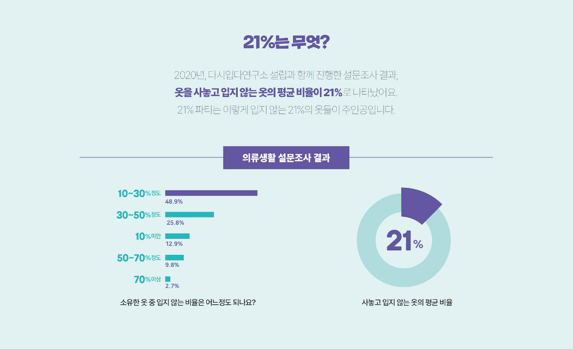 다시입다연구소의 설문조사 결과, 버릴 옷이 아닌 사 놓고 안 입는 옷의 평균 비율이 21%라고합니다. 이렇게 입지 않고 옷장 속에만 있던 21%의 옷이 주인공이 된 파티가 바로 21% 파티입니다.