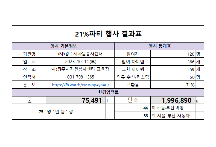 이 71% 교환율의 환경 효과는 놀라웠습니다. 75명의 1년 음수량인 75,491L의 물을 지킬 수 있었으며, 서울부터 부산까지의 비행 44회와 서울부터 부산까지 36회 자동차로 이동 시 발생되는 탄소 1,996,890g을 의류 물물교환 캠페인을 통해 쉽게 배출량을 절감했다는 결과를 확인할 수 있었습니다.