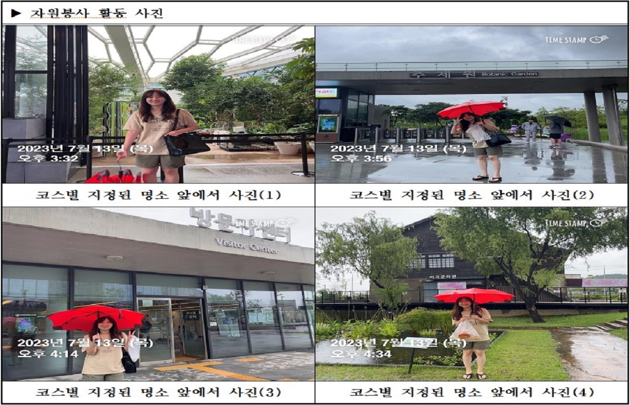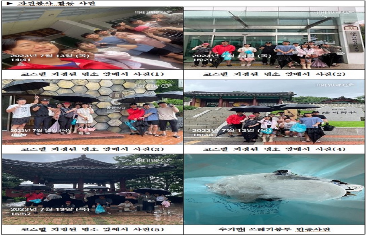 - 두루마블 줍깅은 3개의 코스로 구성되었으며, 코스별 지정된 명소사진 및 수거한 쓰레기봉투 인증 결과보고서를 제출하면 일 최대 2시간, 월 최대 8시간까지 봉사시간 인정