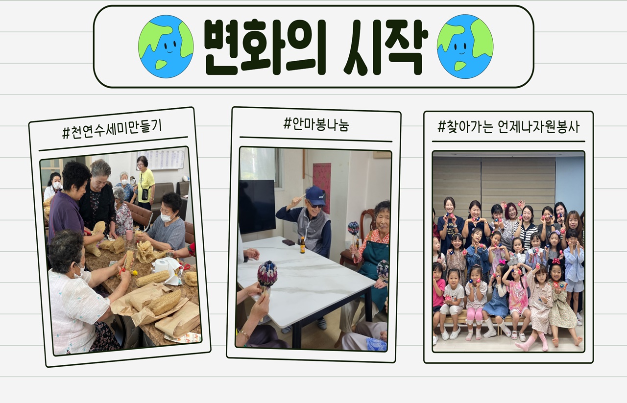 그리고 지역사회에 봉사의 소중함을 전하고자 마을 단위별, 아파트별 자원봉사 공동체를 형성하여 내가 사는 곳에서 손쉽게 봉사하고, 특히 신규 봉사자와 장기 미 활동자들을 위한 편리한 환경을 조성하여 쓸모없어 보이는 자원을 재활용하는 다양한 사업을 기획하였어요.