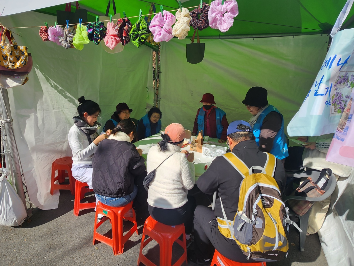 폐현수막으로 장바구니 제작과 버려지는 옷들을 활용하여 곱창 머리끈, 모자, 앞치마 등을 만들어 재탄생 시키며 각 마을축제에 참여하여 지역주민들도 업사이클링에 참여 할 수 있도록 체험부스도 진행하며 온실가스 줄이기 홍보도 함께 진행하였습니다.