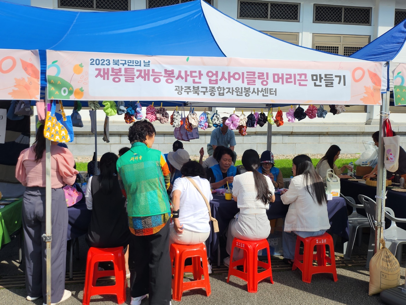 어디든 지역 축제, 워크숍 등 많은 곳에서 현수막을 사용하고 버려집니다. 광주광역시북구자원봉사센터는 지구를 위해 재봉틀 봉사단을 양성하여 폐현수막과 버려지는 옷을 활용하여 탄소중립 실천에 힘을 모으고 있습니다.