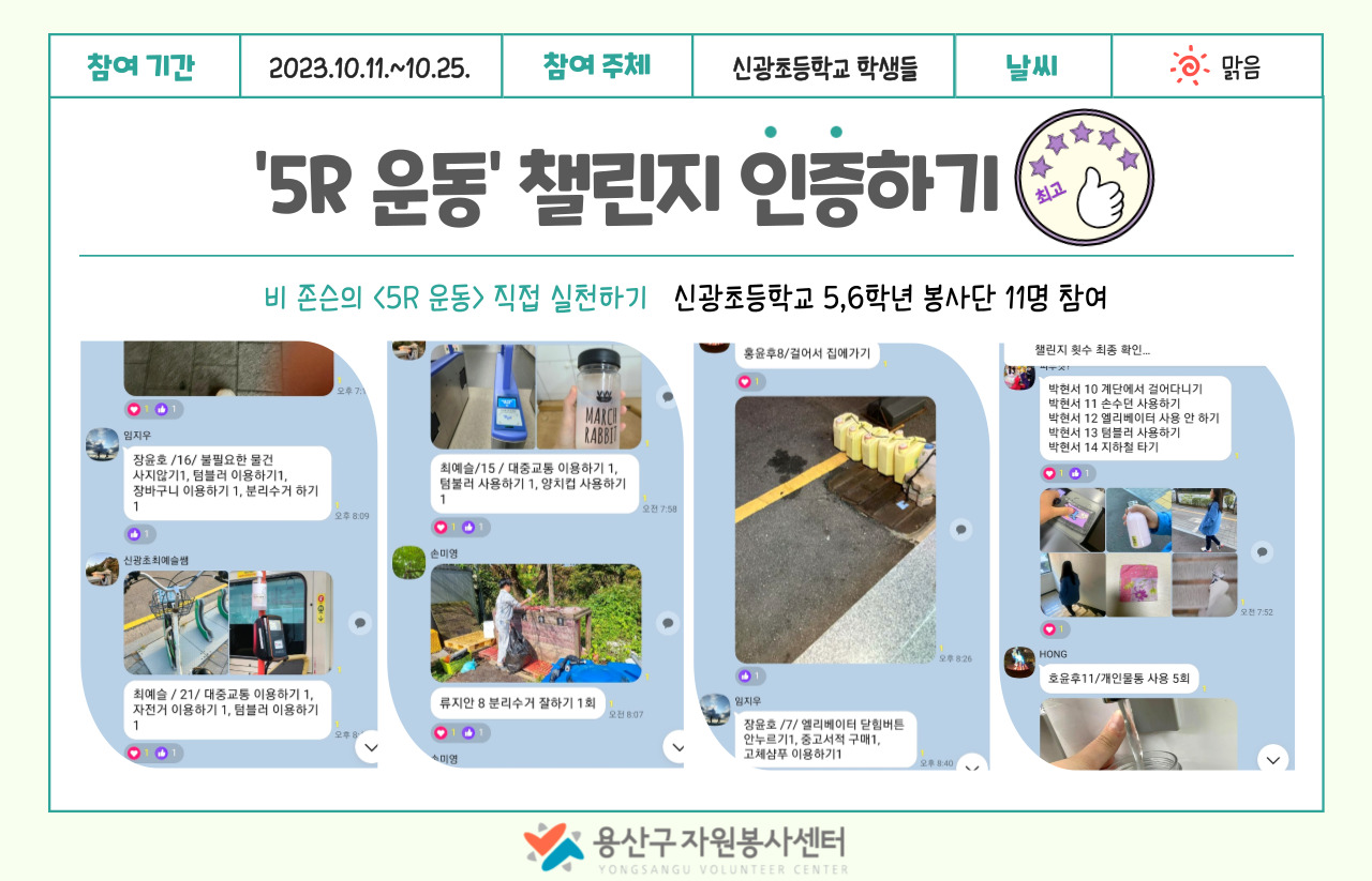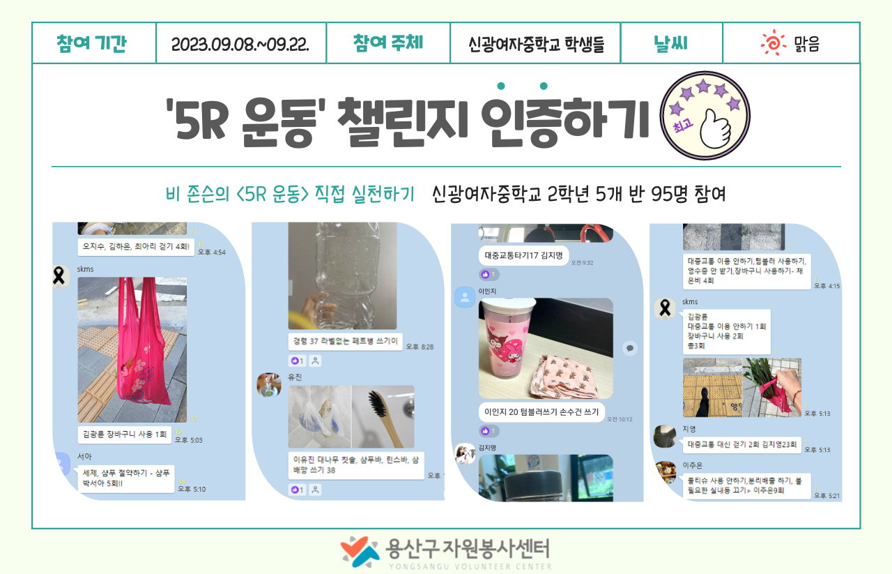 신광여중 학생들은 교육시간에 작성한 5R 실천 목록을 기반으로 2주 동안 매일매일 반별로 챌린지를 단체 카카오톡 채팅방에 인증했습니다.
