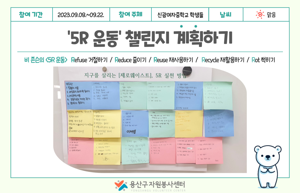 환경교육 프로그램 마지막 시간에는 「나는 쓰레기 없이 산다(Zero Waste Home)」의 저자이자 제로 웨이스트 운동의 창시자인 비 존슨이 제시한 “5R 운동”(참고 : https://terms.naver.com/entry.naver?docId=1201384&cid=40942&categoryId=31615) 챌린지 실천 방법을 학생들이 직접 작성했습니다. 5R 운동이란 Refuse(거절하기), Reduce(줄이기), Reuse(재사용하기), Recycle(재활용하기), Rot(썩히기)를 말합니다.