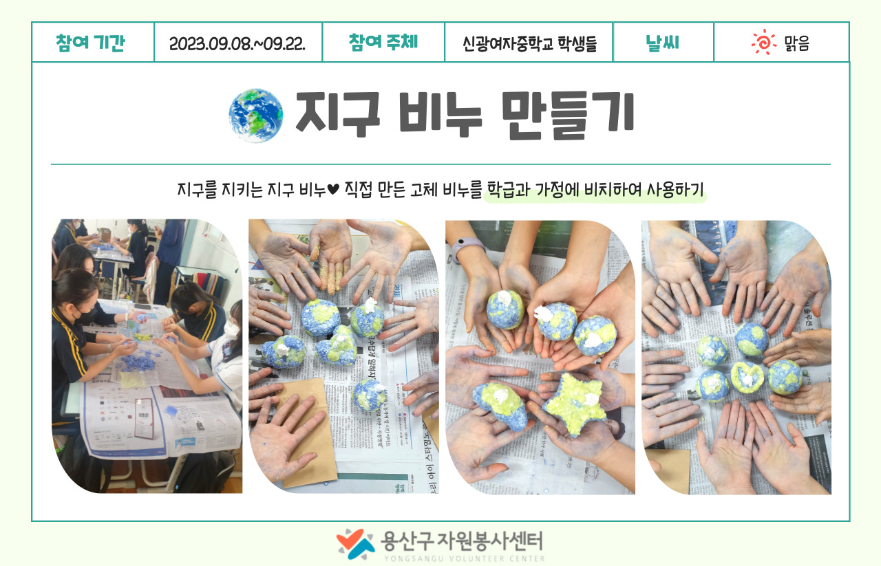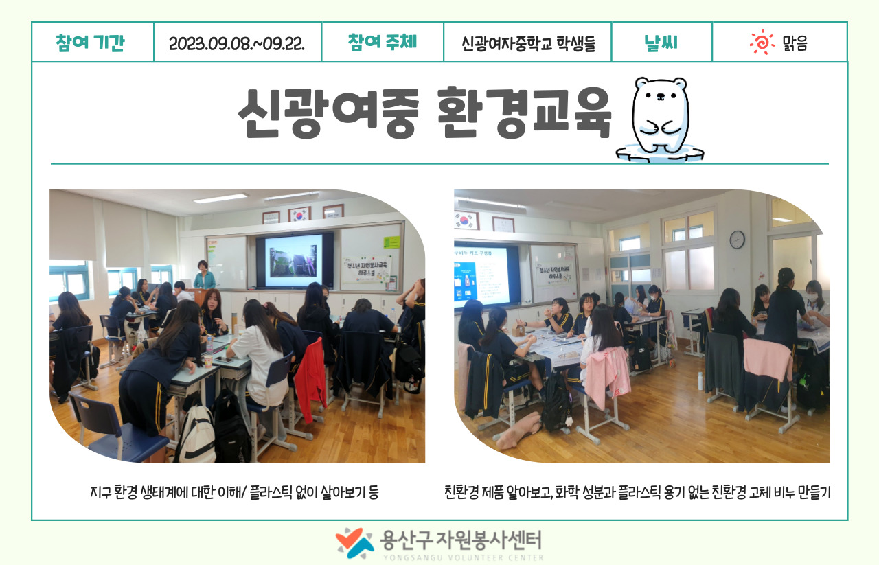 본 센터는 상반기 학교에서 학생들에게 기후위기 관련 환경교육을 진행하면서 1회성 교육에 그치고 마는 점이 매우 안타까웠습니다. ‘누구나’ 환경을 지키는 것이 중요하다고 생각하지만 ‘아무나’ 시작하고 실천하는 것은 쉽지 않습니다. 용산구자원봉사센터는 관내 학교 학생들에게 환경교육을 하고 그 실천으로 제로 웨이스트 챌린지를 이끌었습니다.