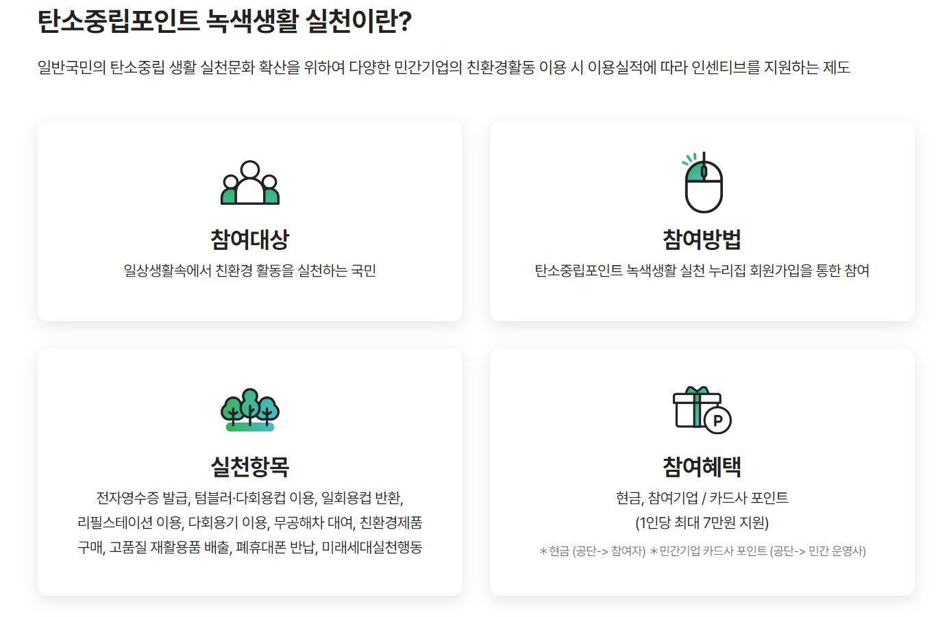 한국환경공단에서는 일상 속 탄소중립 실천을 혜택으로 주기 위해 탄소중립포인트 녹색생활 실천 포인트 제도를 시행하고 있습니다.(사이트 참고 : https://www.cpoint.or.kr/netzero/main.do) 일반 국민의 탄소중립 생활 실천문화를 확산시키기 위해 친환경 활동 이용 시 인센티브를 주는 것입니다.