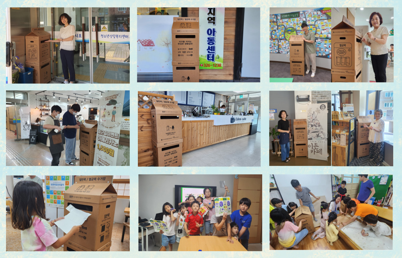 종이팩 사용이 가장 많은 카페, 제과점 등에서 탄소중립 실천 가게로 동참하는 곳이 늘어나고 있고, 공공기관, 지역아동센터, 아파트까지 수거함을 배부하여 종이팩 수거 활동에 열과 성을 다하고 있다.