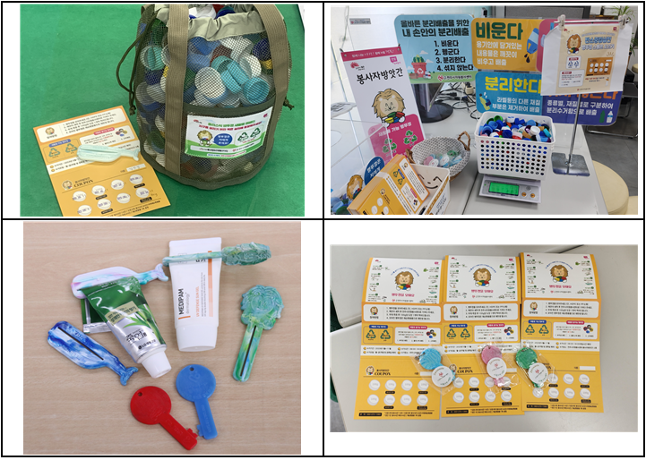 저희 센터에서는 병뚜껑을 수집하는 방법으로 병뚜껑을 모아오면 무게를 잰 후 100g당 도장 1개를 찍어주고 있습니다. 최대 800g을 다 모으면 시간인증과 함께 병뚜껑으로 만든 자원재순환용품 치약짜개를 선물로 드렸습니다.