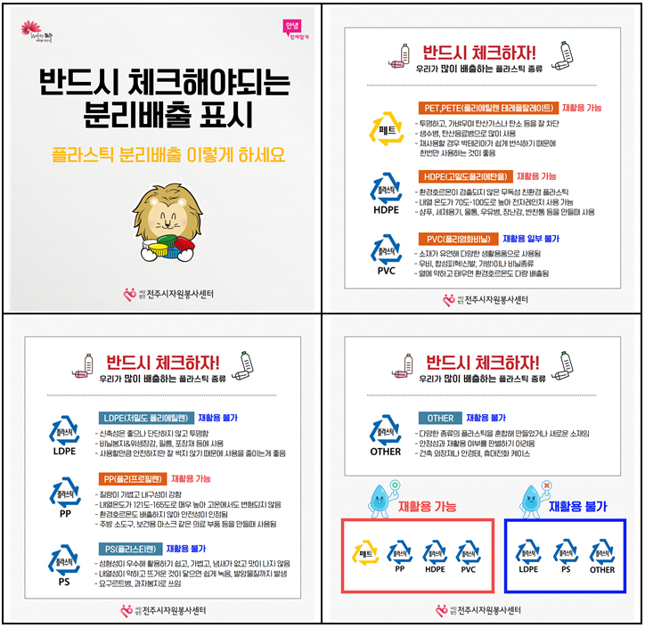 재활용이 되는 플라스틱의 종류로 PP와 HDPE로 두 가지이며, 고무가 붙어있지 않아야 하는 조건입니다. 그런데 간혹 재활용이 안되는 제품을 모아가지고 오는 경우가 있었습니다.