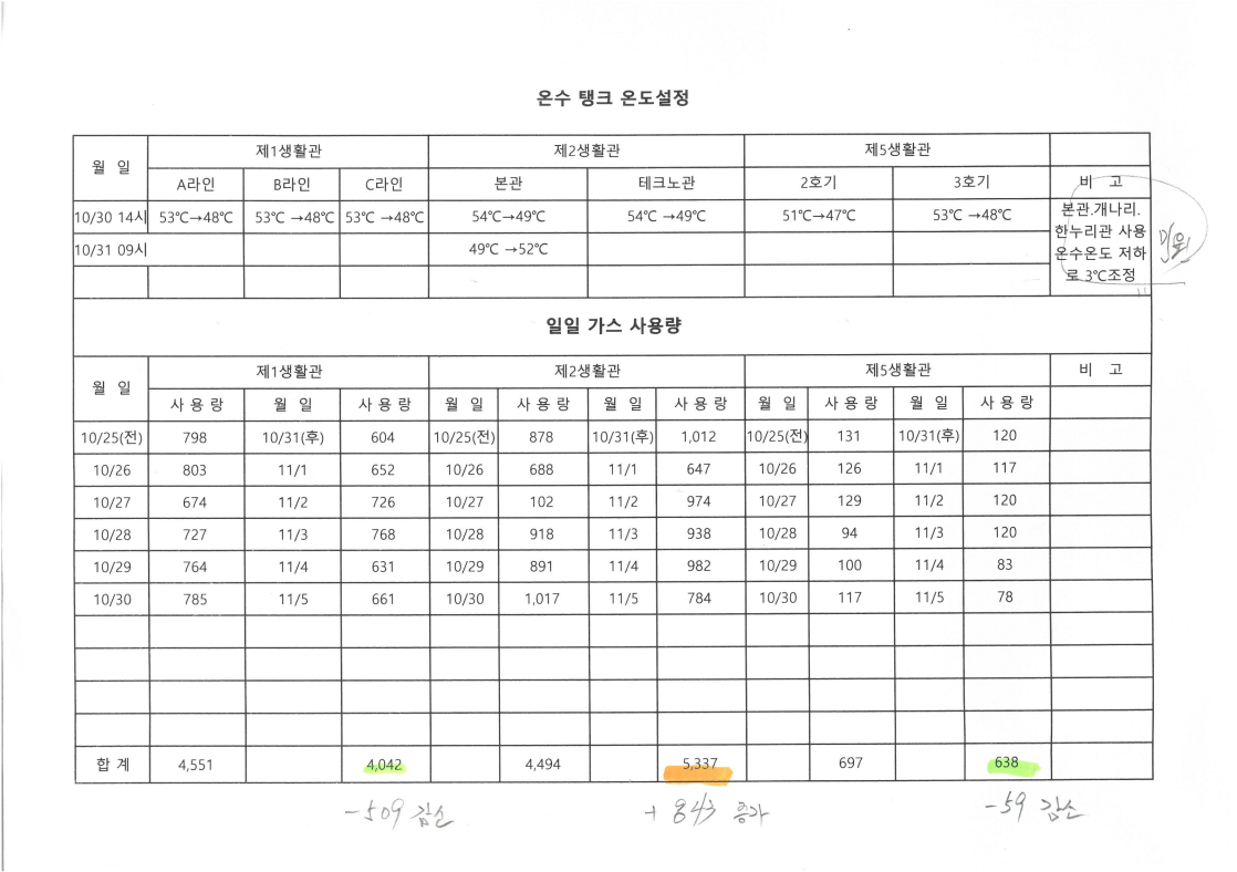 제1생활관 제5생활관 모두에서 일일 가스 사용량이 줄었고, 그에 따라 탄소감축을 이뤄낼 수 있었습니다. 이렇게 에너지는 감축될 수 있었지만 시행 초기에는 기존 예측과 다른 기술적 결함(온수를 생성하는 기계의 온도를 낮출 경우, 많은 사람들이 동시에 샤워장치를 사용하는 아침과 저녁시간에 일시적으로 미온수가 공급되는 문제가 발생함.)이 발생하였습니다. 이러한 문제를 해결하기 다음과 같은 방안을 마련하였습니다. 일정 기간동안 일별 기숙사생의 온수 사용량을 수치적으로 파악하여, 온수가 많이 사용되는 시간대에는 기존 온도를 유지하는 방면으로 수정하는 방향으로 추후 온수 온도 운행을 할 예정입니다.