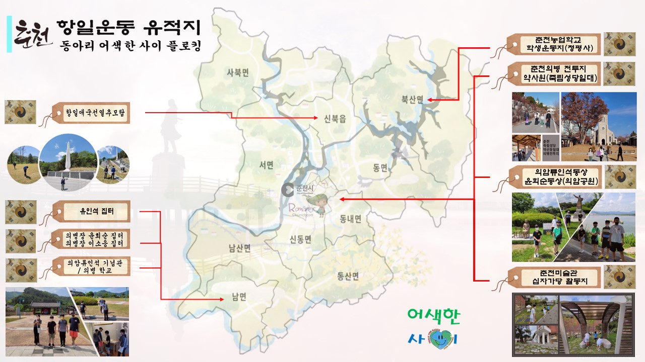 광복회 강원도 지부에서 진행한 행사에 참석한 적이 있어요. 행사를 보면서 감동을 받았고, 나라를 위해서 희생하신 순국선열 분들에게 감사한 마음을 가지게 되었답니다. 뭔가 의미있는 활동을 하고 싶어서 한 달에 한 번씩 저희는 춘천에 있는 항일 유적지로 함께 플로깅을 다니면서 역사 지도를 만들고 있어요. 처음 모였을 때 친구 한 명이 아직은 어색하다고 해서 저희 모임 이름을 ‘어색한 사이’로 지었답니다.
