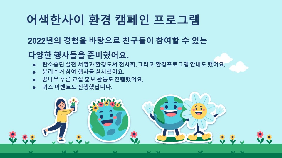 첫 번째로 환경 캠페인의 조금 더 자주 실행해서 친구들의 참여를 더욱 늘릴 예정입니다.