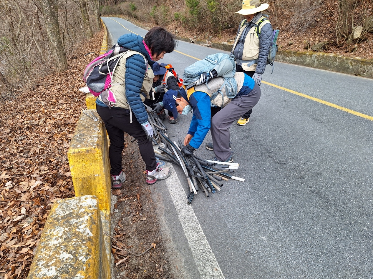 2개의 그룹으로 나누머 등산로와 계곡을 돌며 작게는 과자봉지부터 크게는 인근 사업장에서 사용하는 폐스티료품, 철조망 등 다양한 쓰레기를 발견했습니다.