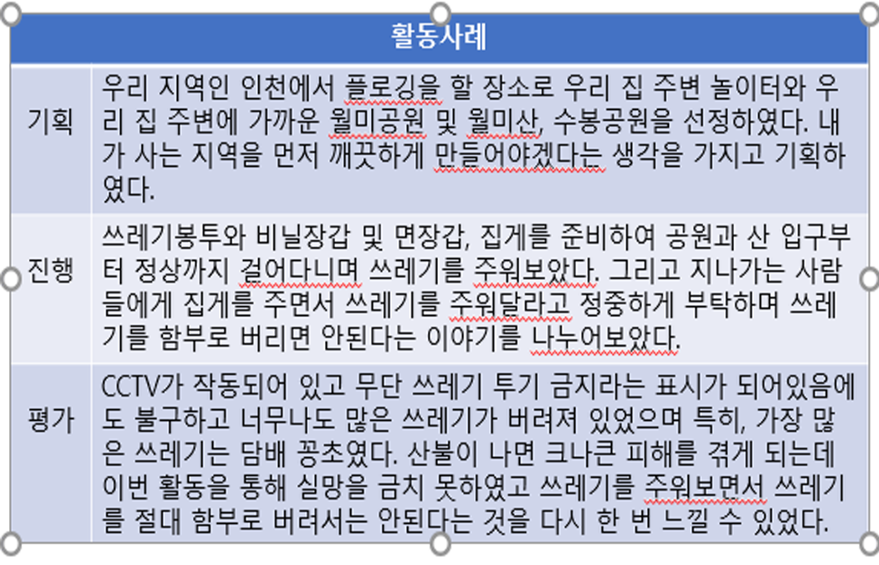 인천 구월동 일대를 돌아다니며 주말에 플로깅 활동을 했다. 공중화장실 창고에 집게, 쓰레기 봉투 등이 배치되어 있어 사용하였고 마지막에는 쓰레기 분리수거를 한 뒤에 버렸다. 한계는 플로깅 하는 사람 인원은 적은데 쓰레기는 너무 많아 쓰레기를 모두 줍는 것에 한계가 있었다. 그만큼 사람들이 쓰레기를 길거리에 많이 버린다는 것이다.
