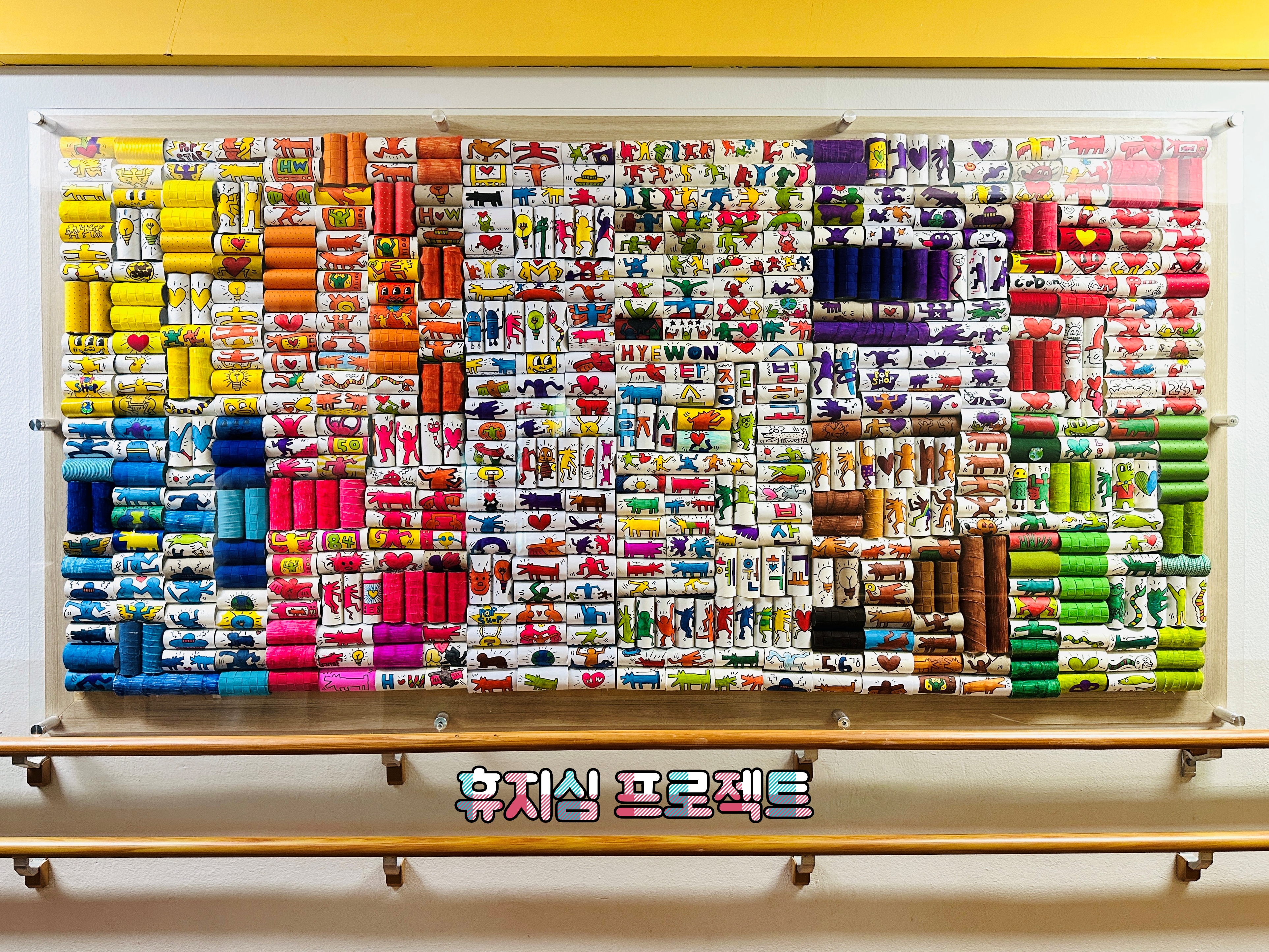 학교와 가정에서 사용 후 버려지는 휴지심을 모아 대형 조형물로 재탄생시키는 활동을 기획하였습니다. 교육공동체가 가정과 학교에서 한마음으로 4월부터 9월까지 6개월간 800여 개의 휴지심을 모았고, 이렇게 모인 휴지심을 학생과 교사의 손길로 다듬어 아름다운 작품으로 완성했습니다. 키스 해링의 대표작을 오마주하여 휴지심 하나하나마다 그림을 그리고 꾸며 가로 2m 30cm, 세로 1m 크기의 조형물을 제작하였습니다. 모두가 함께 힘을 모아 작품을 완성했다는 성취감과 쓰레기 활용하여 새롭고 가치 있게 업사이클링 했다는 점에서 우리에게 매우 의미있는 활동이었습니다.