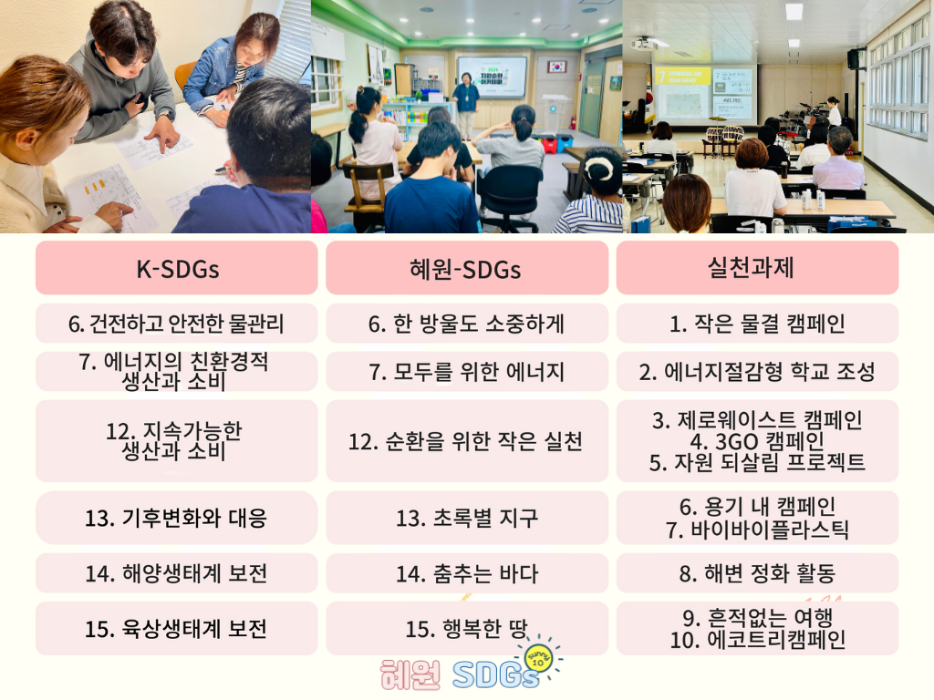 처음에는 구체적인 활동 자체에 집중했지만, 시간이 지나며 ‘지속 가능성’에 대해 더 깊이 생각하게 되었습니다. 2015년 UN에서 결의한 지속 가능 발전 목표(SDGs: Sustainable Development Goals)처럼, 저희도 우리 학생들과 함께 더 나은 미래를 향해 나아갈 수 있는 방법을 찾고 싶었습니다. 그렇게 해서 탄생한 것이 ‘혜원-SDGs’입니다. 학생들이 실천하며 삶 속에서 느끼고 배울 수 있도록 지속 가능하고 확장성 있는 10가지 과제를 만들어, 모두가 함께할 수 있는 길을 만들어 가고자 합니다.