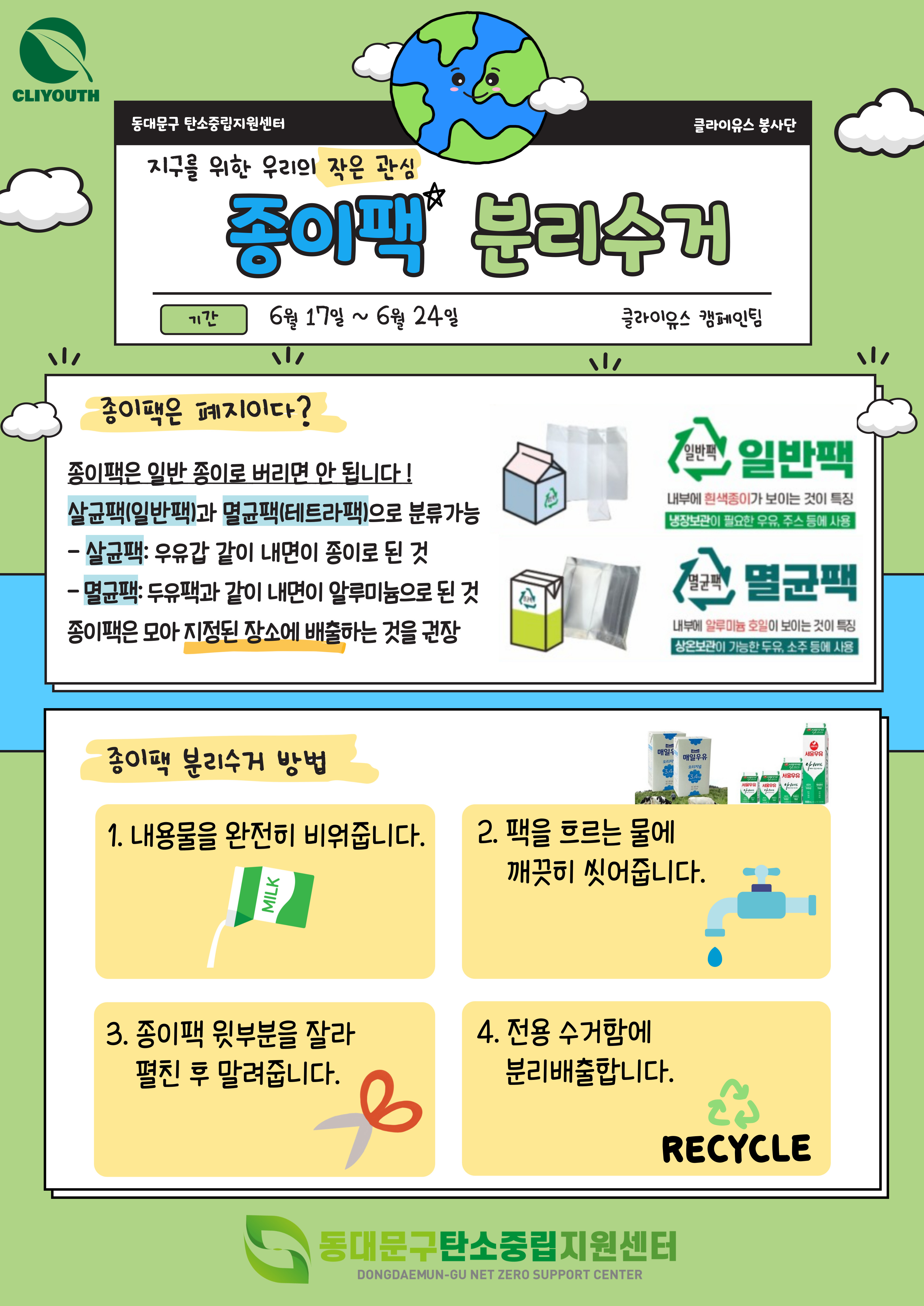 주변에서 우유갑, 두유팩 등을 일반쓰레기로 버리는 경우를 많이 볼 수 있는데, 이렇게 버려지는 종이팩이 아까워서 본 캠페인을 기획하였습니다. 현재 서울시에서 종이팩만 따로 모아 배출할 수 있는 방법은 행정복지센터 수거, 스마트 수거기 이용, 제로웨이스트샵 이용으로 크게 세 가지인데, 모두 직접 수거 거점까지 찾아가야 하는 방식입니다. 따라서 종이팩은 금속이나 유리, 페트 등처럼 집앞에서 손쉽게 분리배출하지 못하는 상황입니다. 종이팩은 재활용이 가능하지만 일반종이와는 따로 배출해야 하는 사실을 인지하지 못하는 경우가 많아서 재활용률이 15% 정도에 불과합니다. 따라서 캠페인을 통해 종이팩 분리수거에 대한 학생들의 인식을 제고하고, 학교 내에 종이팩 분리수거함을 만들어 탄소중립에 기여하고자 하였습니다.
