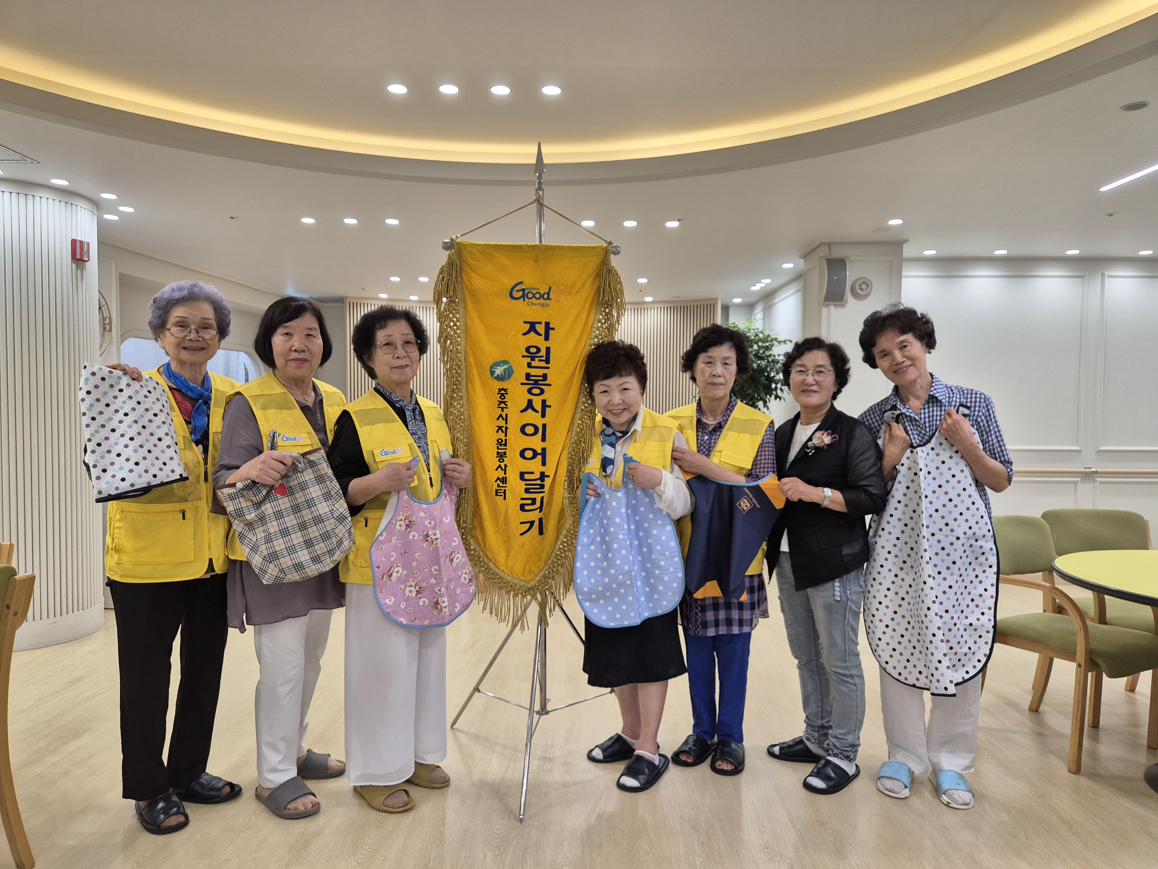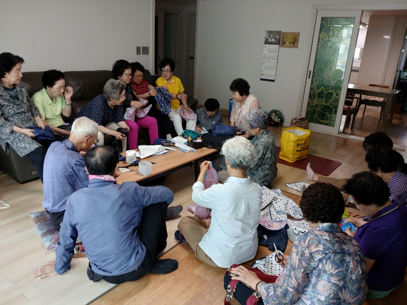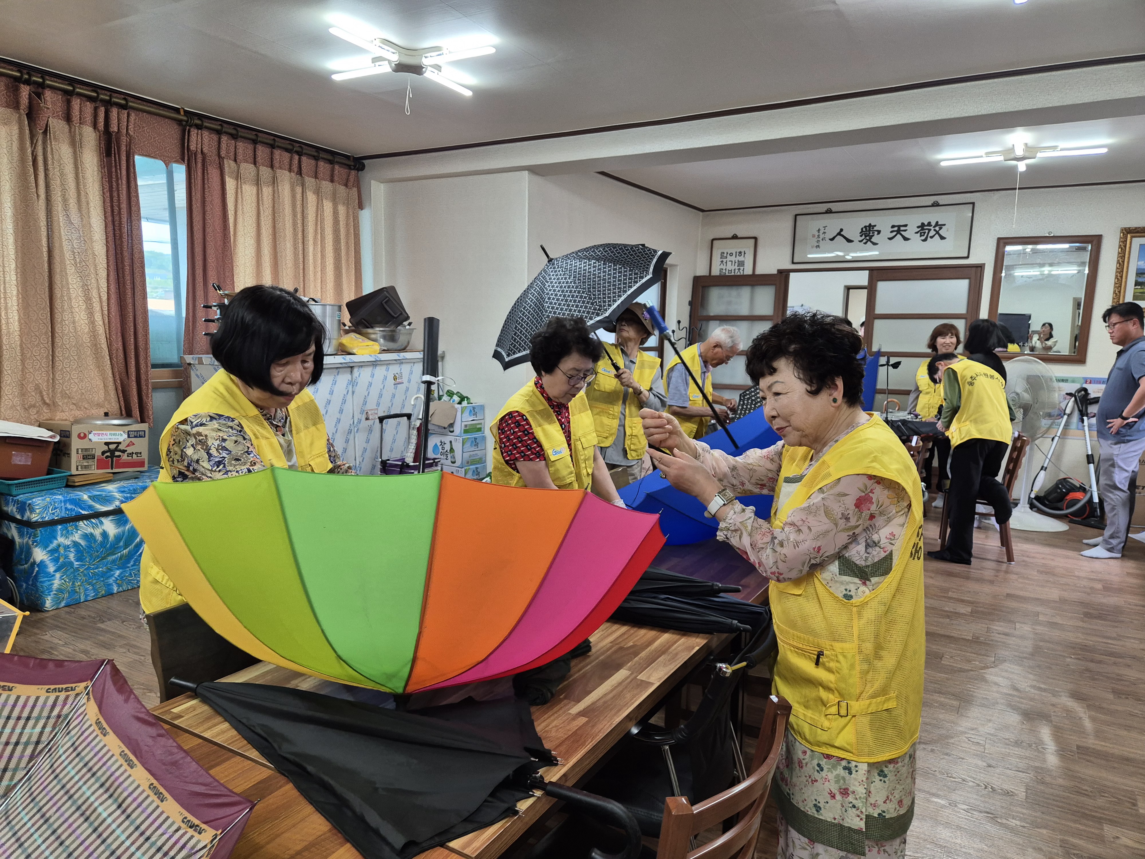 충주시자원봉사센터의 "오뚜기봉사단"이라는 방수천으로 앞치마 및 턱받이를 만드는 봉사단체와 고장나고 버려지는 우산을 수리하는 "뚝딱우산수리봉사단"의 운명적인 만남입니다. 평균 연령대가 80세인 대표 실버봉사단으로 두 봉사단체가 서로 협업하여 상의하고 열성적으로 봉사활동을 전개하고 있습니다. '오뚜기봉사단'은 우산 천을 재단하여 손 바느질과 재봉 기술이 탁월하신 여성 어르신분들이 주로 활동을 하시고 '뚝딱우산수리봉사단'은 남자 어르신 봉사자분들이 우산 수리 기술자이면서 우산천을 분리하는 작업을 주로 하고 계십니다. 매월 2회 정기적으로 한 공간에 다같이 모이셔서 각 단체가 가진 자원과 노하우를 공유하여 더욱 효과적인 봉사 활동을 펼치고 있습니다.