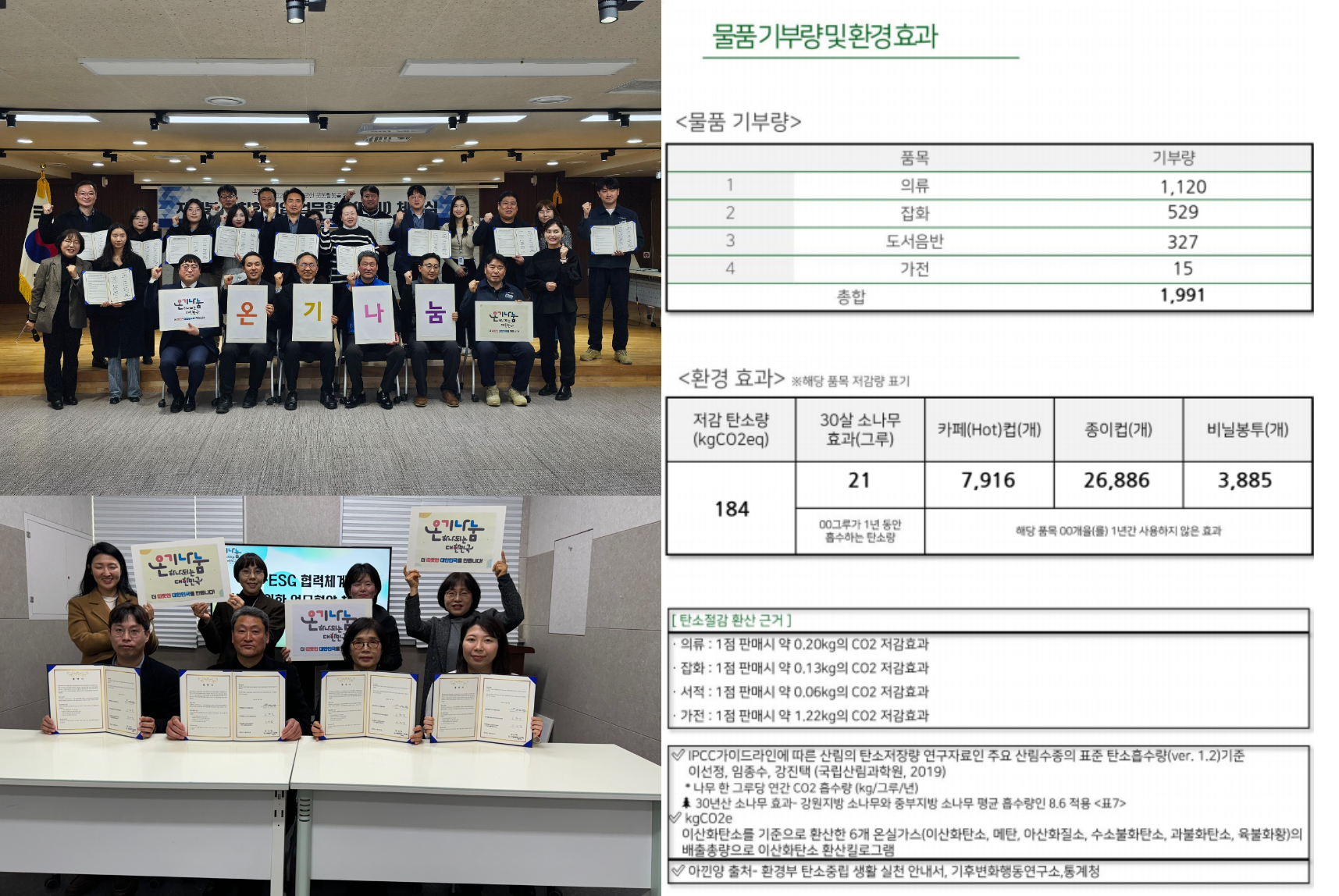 3. 물품 기부 캠페인 :의류 1,120 /잡화 529 / 도서음반 327 /가전: 15 (총 1,991개)